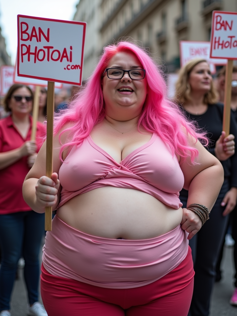 group of obese fat protesters with pink hair holding signs "ban PhotoAI.com"