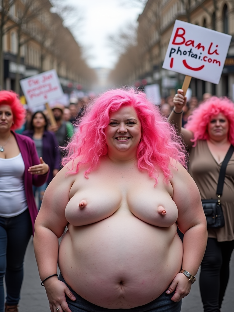 group of obese fat protesters with pink hair holding signs "ban PhotoAI.com"