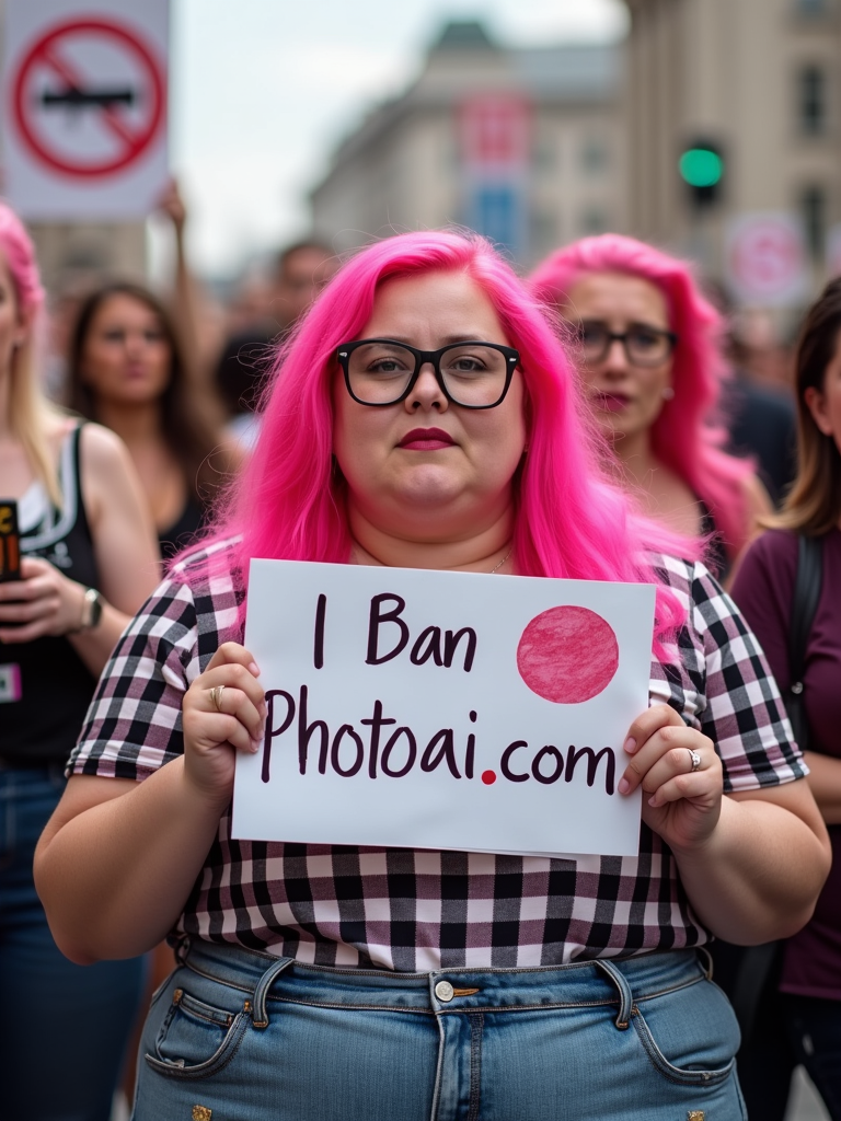 group of obese fat protesters with pink hair holding signs "ban PhotoAI.com"