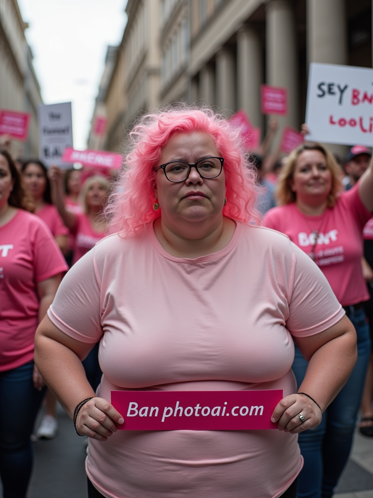 group of obese fat protesters with pink hair holding signs "ban PhotoAI.com"