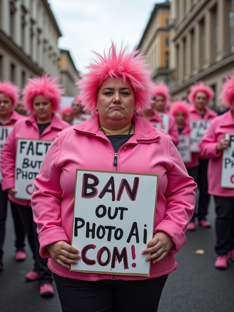 group of obese fat protesters with pink hair holding signs "ban PhotoAI.com"