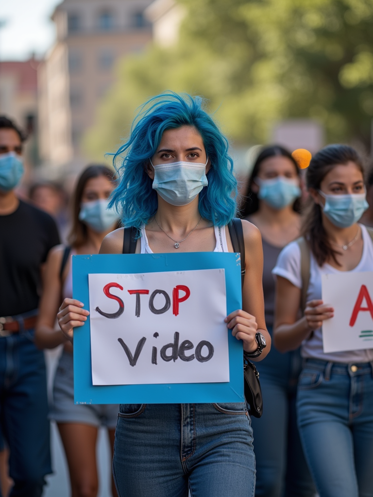 group of protesters in casual clothes with face masks and blue hair holding signs "stop ai video"