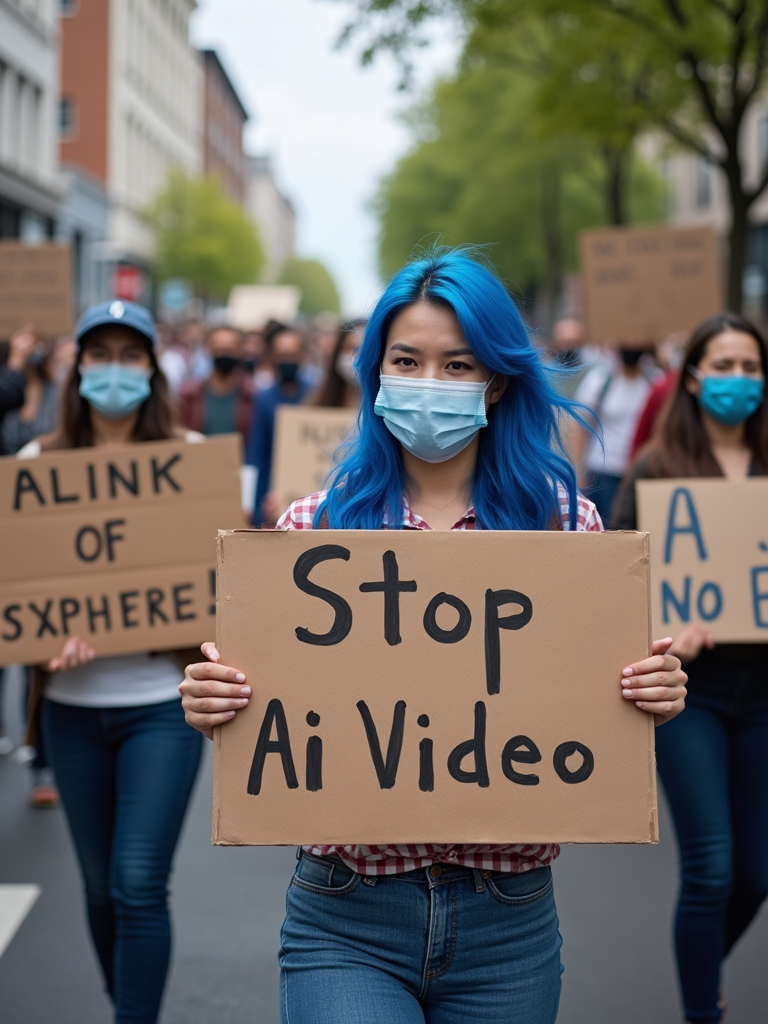 group of protesters in casual clothes with face masks and blue hair holding signs "stop ai video"