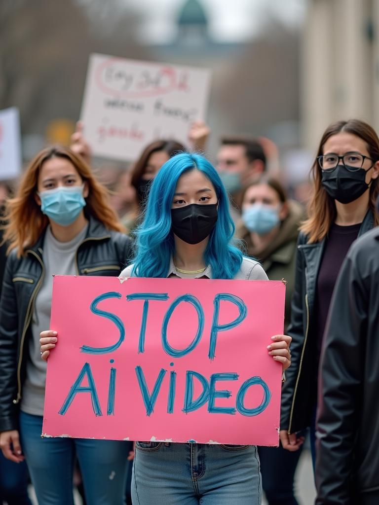 group of protesters in casual clothes with face masks and blue hair holding signs "stop ai video"