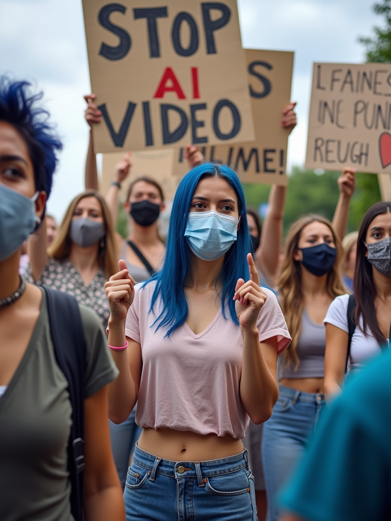 group of protesters in casual clothes with face masks and blue hair holding signs "stop ai video"