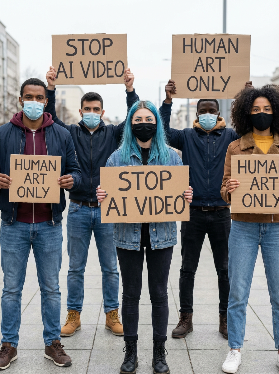 group of protesters in casual clothes with face masks and blue hair holding signs "stop ai video"