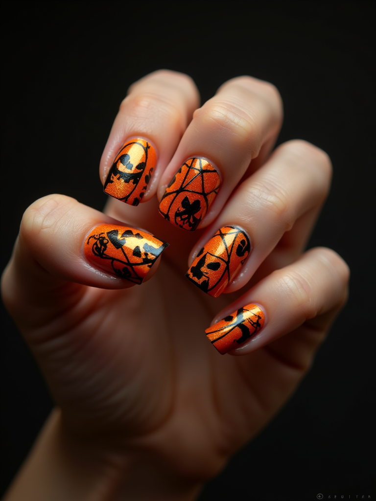 Halloween themed nails with jack-o-lanterns and spider webs, orange and black color scheme, dramatic studio lighting, artistic styling