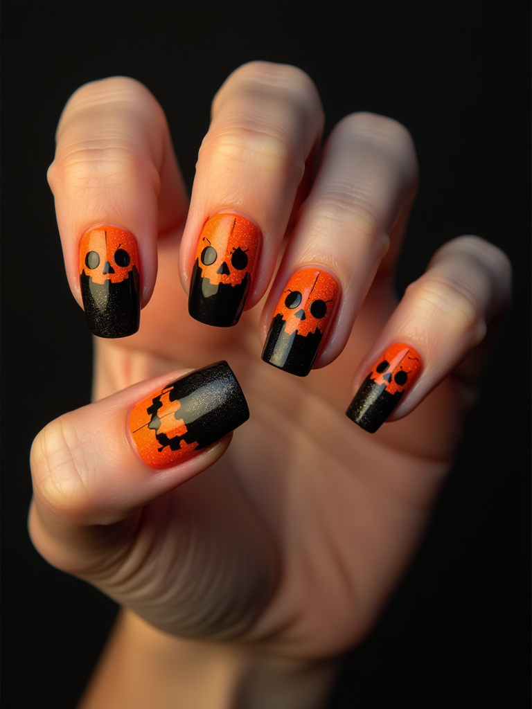 Halloween themed nails with jack-o-lanterns and spider webs, orange and black color scheme, dramatic studio lighting, artistic styling