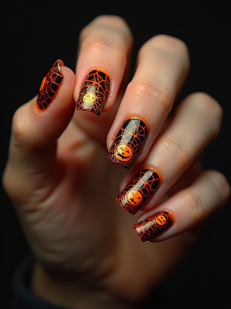 Halloween themed nails with jack-o-lanterns and spider webs, orange and black color scheme, dramatic studio lighting, artistic styling
