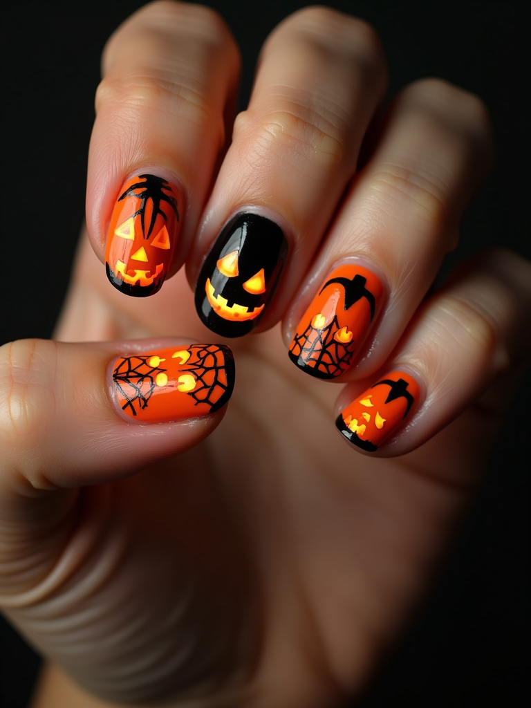 Halloween themed nails with jack-o-lanterns and spider webs, orange and black color scheme, dramatic studio lighting, artistic styling