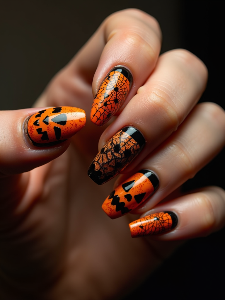 Halloween themed nails with jack-o-lanterns and spider webs, orange and black color scheme, dramatic studio lighting, artistic styling