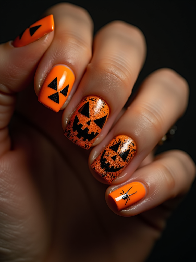 Halloween themed nails with jack-o-lanterns and spider webs, orange and black color scheme, dramatic studio lighting, artistic styling