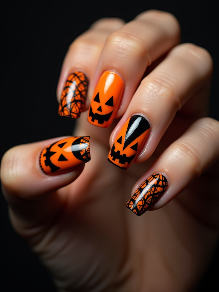 Halloween themed nails with jack-o-lanterns and spider webs, orange and black color scheme, dramatic studio lighting, artistic styling