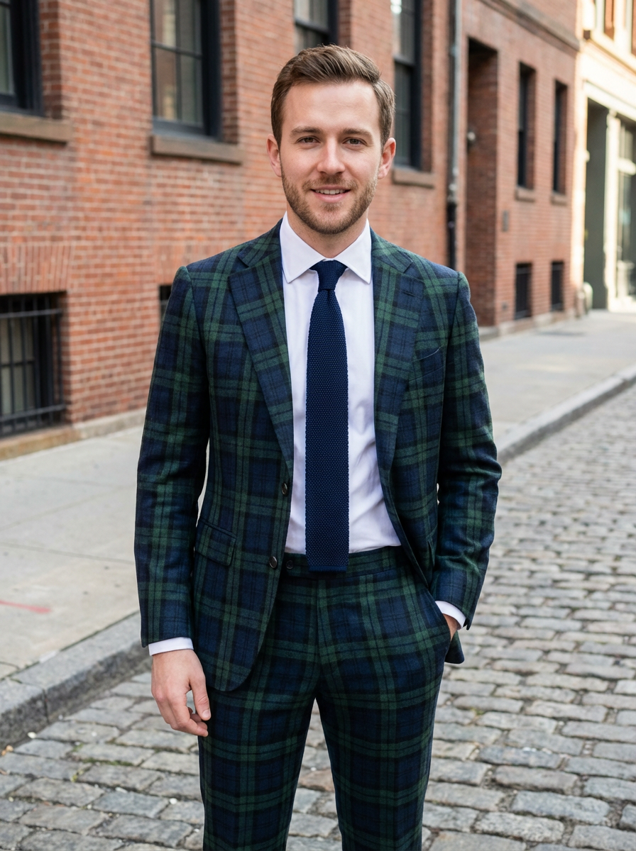 handsome and stylish model showcasing a dappersuit in a bold plaid pattern with a solid-colored shirt and a knitted tie