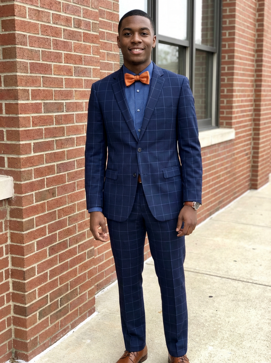 handsome and stylish model showcasing a unique windowpane check suit in a navy blue color with a patterned shirt and a contrasting bow tie