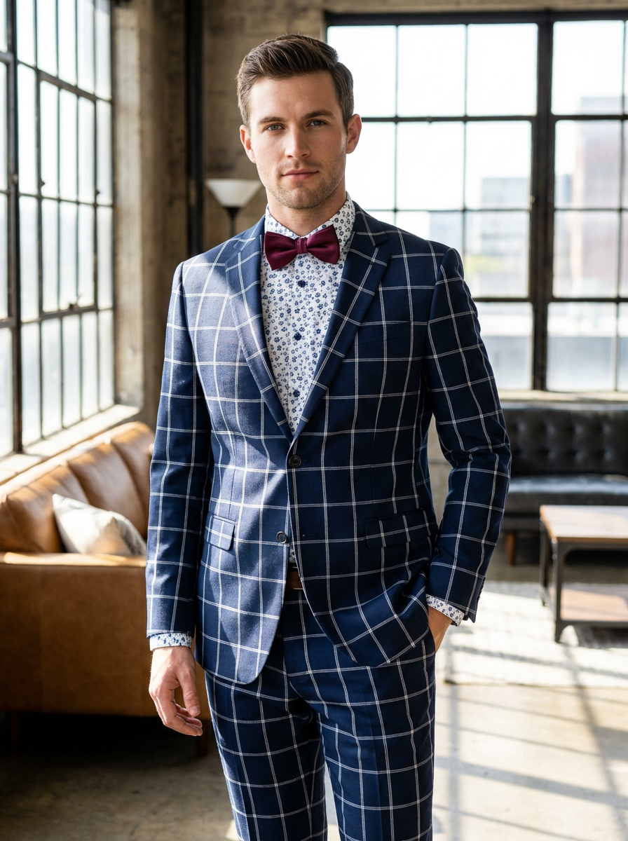 handsome and stylish model showcasing a unique windowpane check suit in a navy blue color with a patterned shirt and a contrasting bow tie