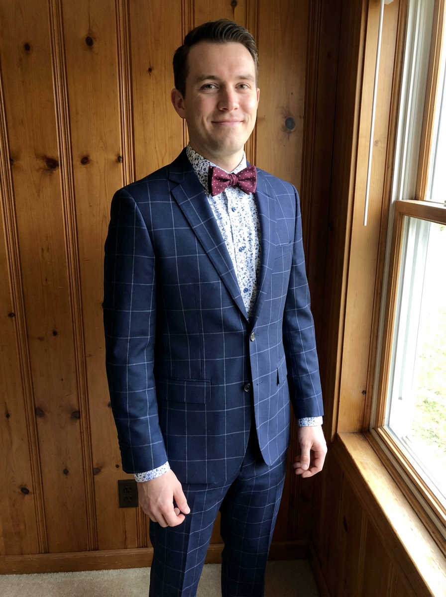 handsome and stylish model showcasing a unique windowpane check suit in a navy blue color with a patterned shirt and a contrasting bow tie