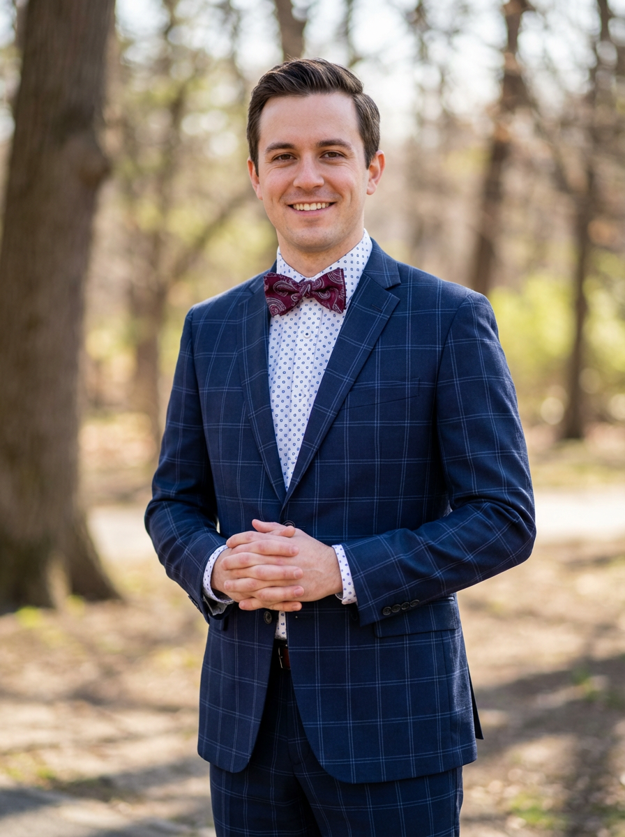 handsome and stylish model showcasing a unique windowpane check suit in a navy blue color with a patterned shirt and a contrasting bow tie