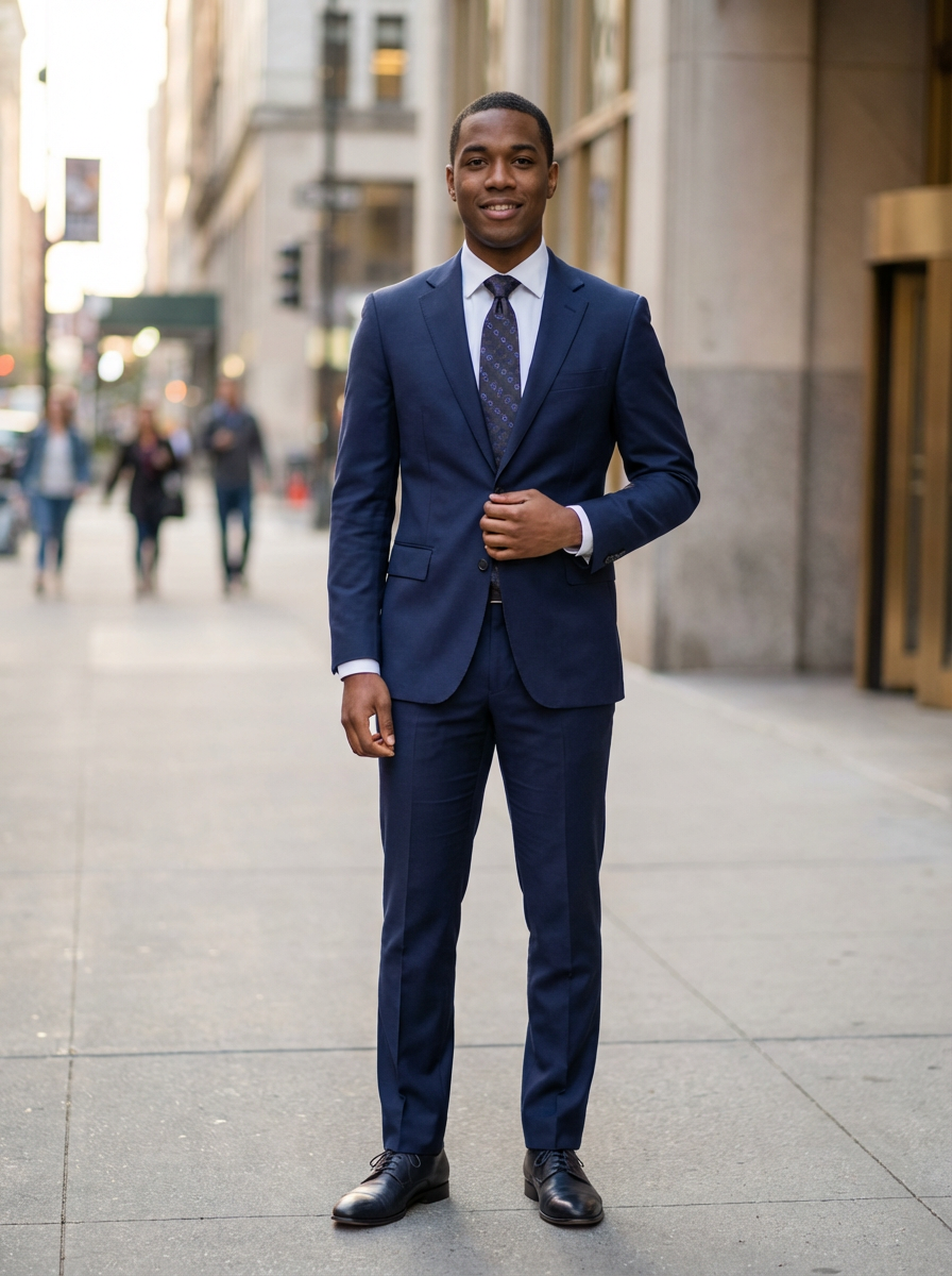 handsome and stylish model wearing a classic navy blue suit with a crisp white dress shirt and a patterned tie