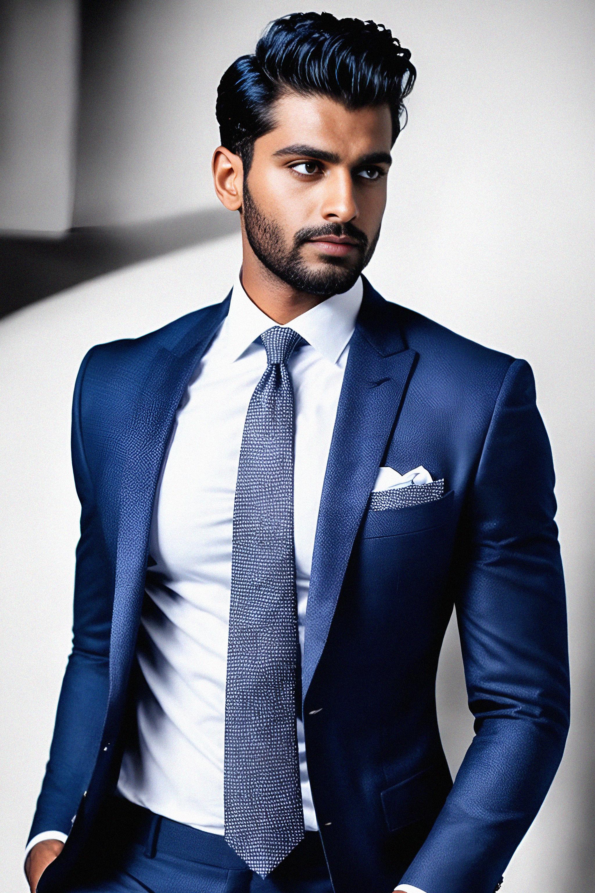 handsome and stylish model wearing a classic navy blue suit with a crisp white dress shirt and a patterned tie