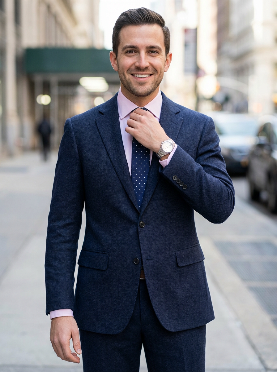 handsome and stylish model wearing a classic navy herringbone suit with a light pink dress shirt and a polka dot tie