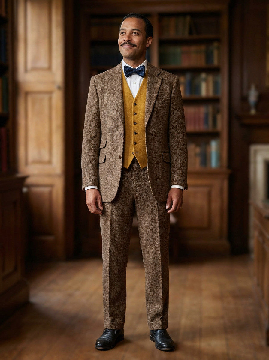 handsome and stylish model wearing a trendy tweed suit with a patterned bow tie and a contrasting vest