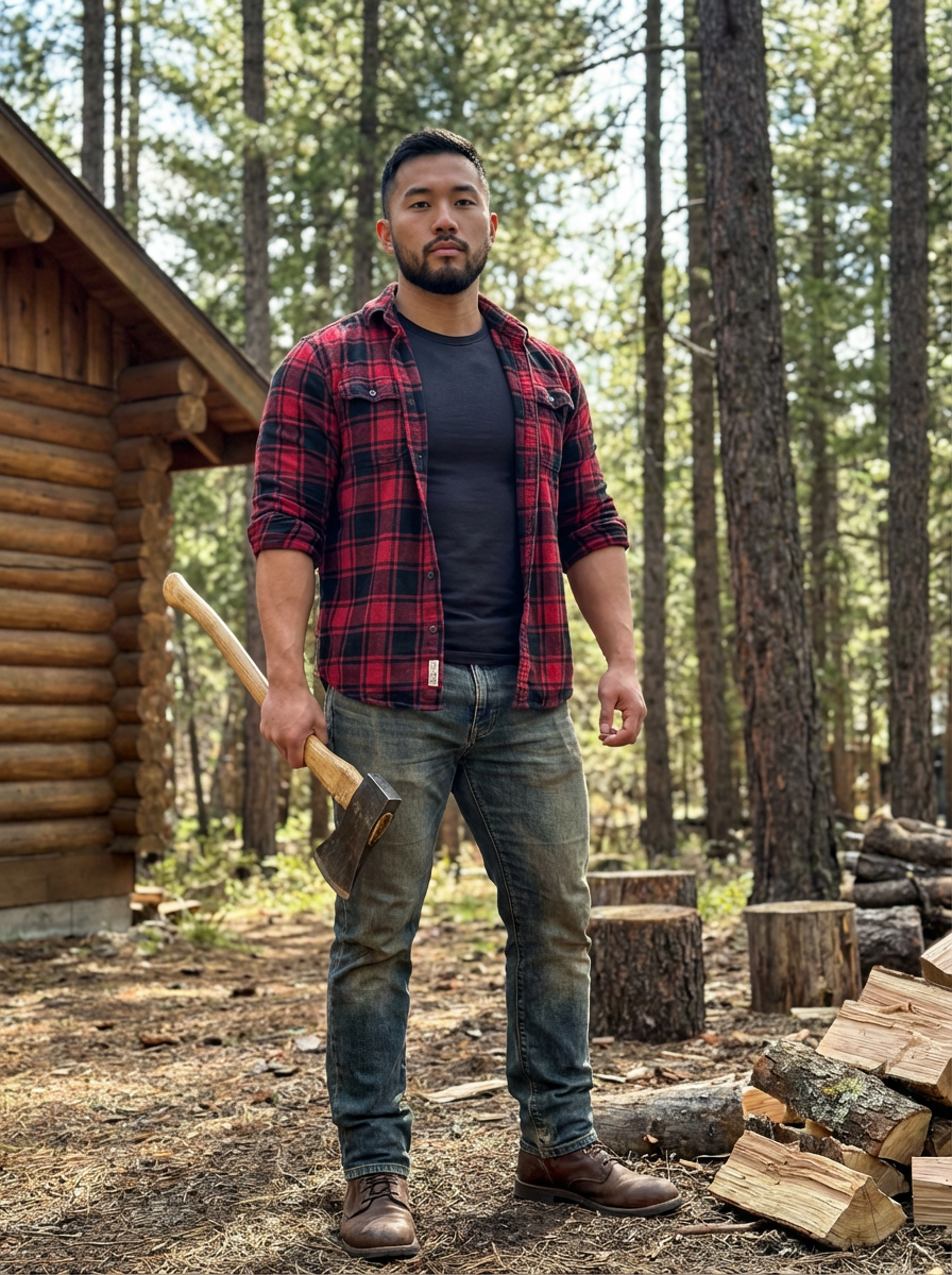 handsome bearded model, tight fitted t-shirt, muscular build visible, masculine lumberjack aesthetic
