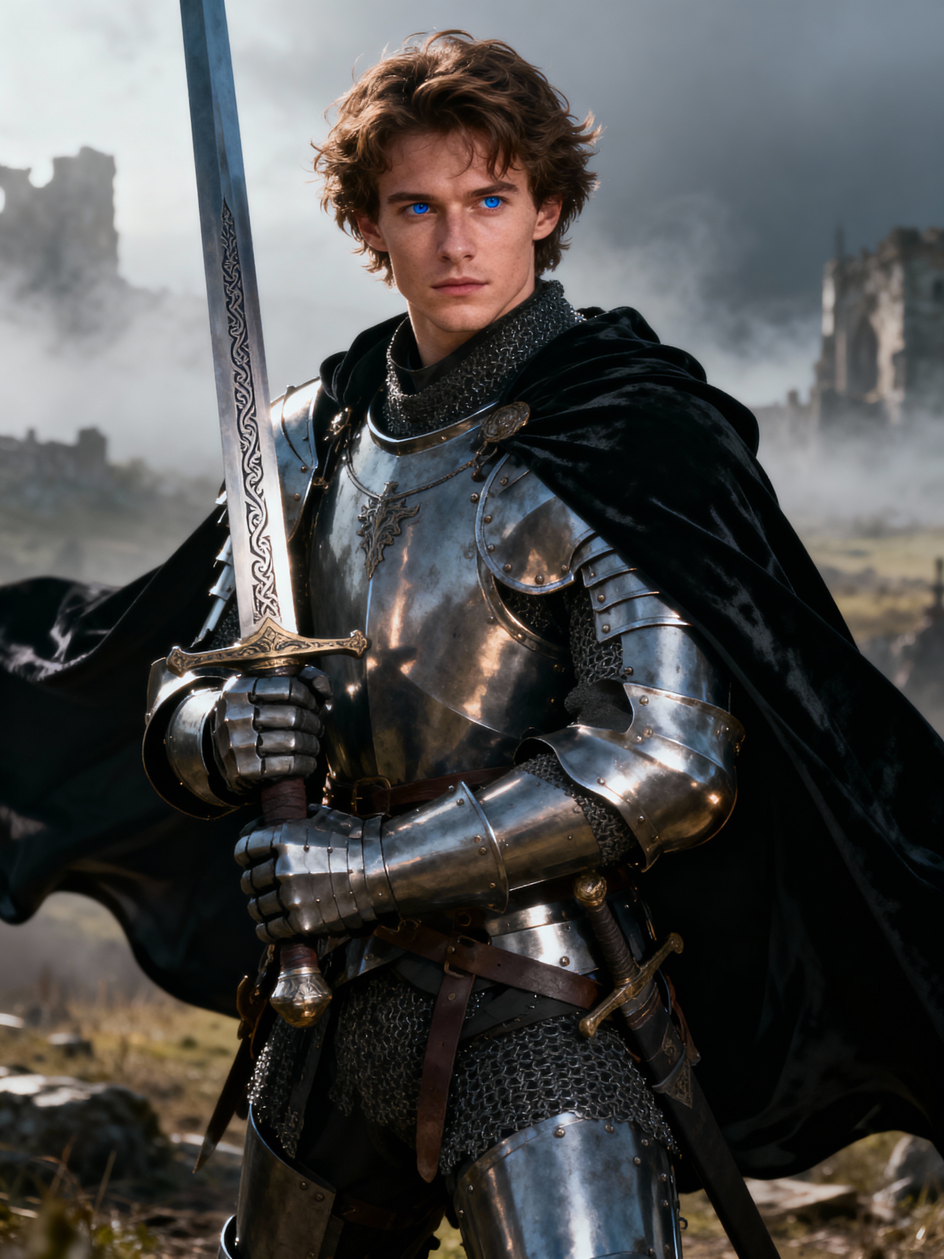 happy model as a Medieval Knight in silver armor, wearing a black elegant cape flowing in the wind, the knight holds a sword in one hand