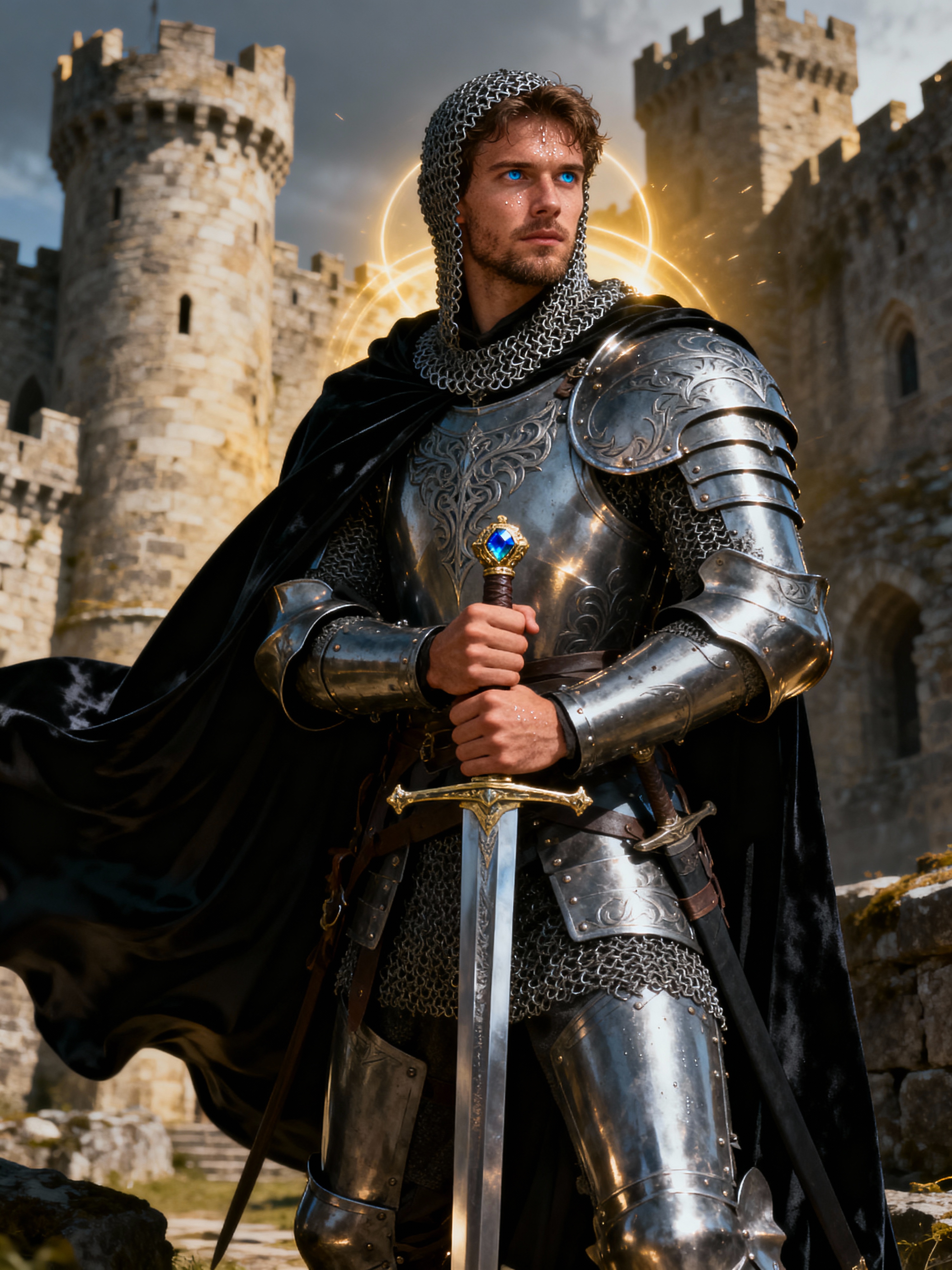 happy model as a Medieval Knight in silver armor, wearing a black elegant cape flowing in the wind, the knight holds a sword in one hand