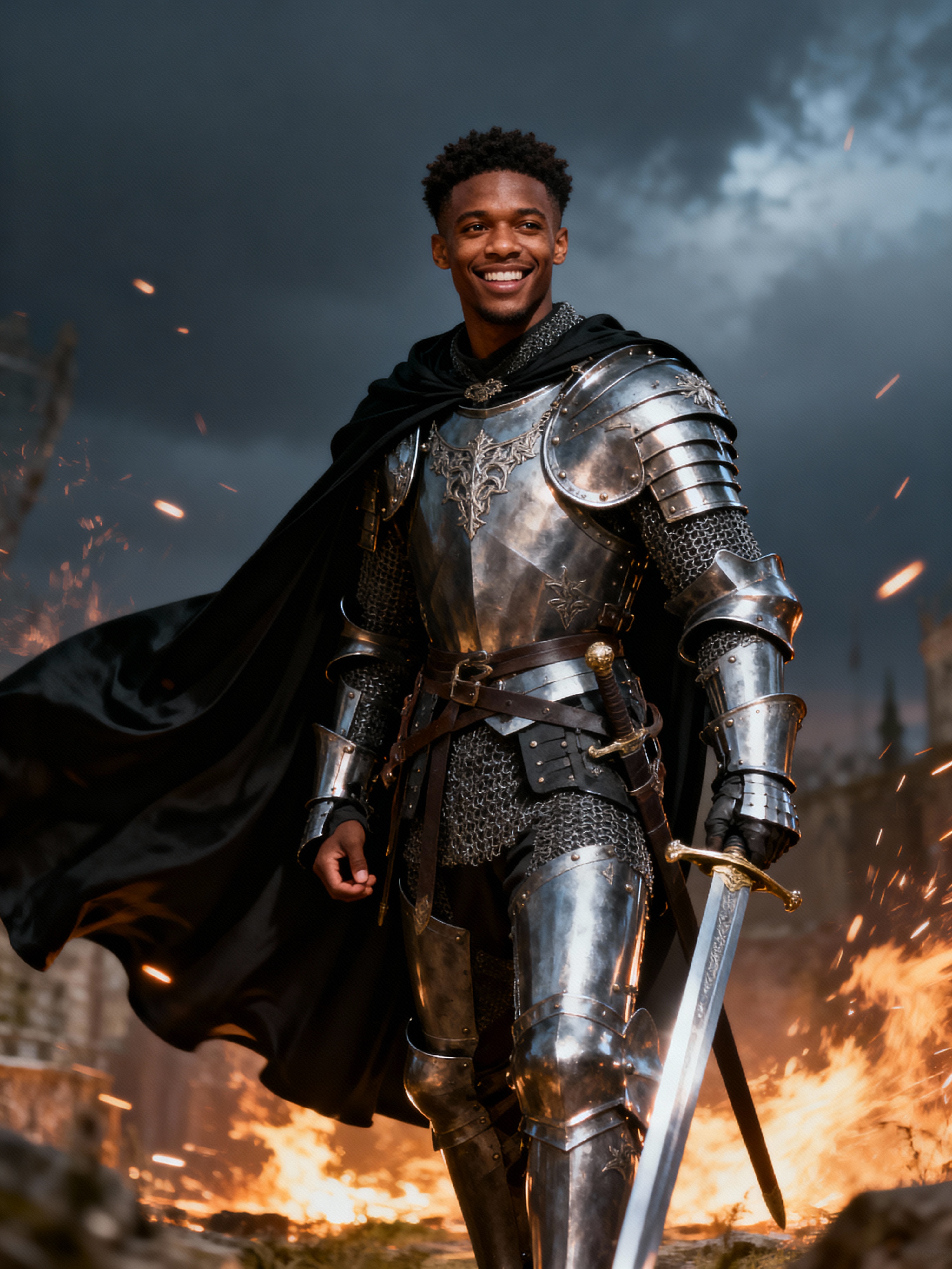 happy model as a Medieval Knight in silver armor, wearing a black elegant cape flowing in the wind, the knight holds a sword in one hand