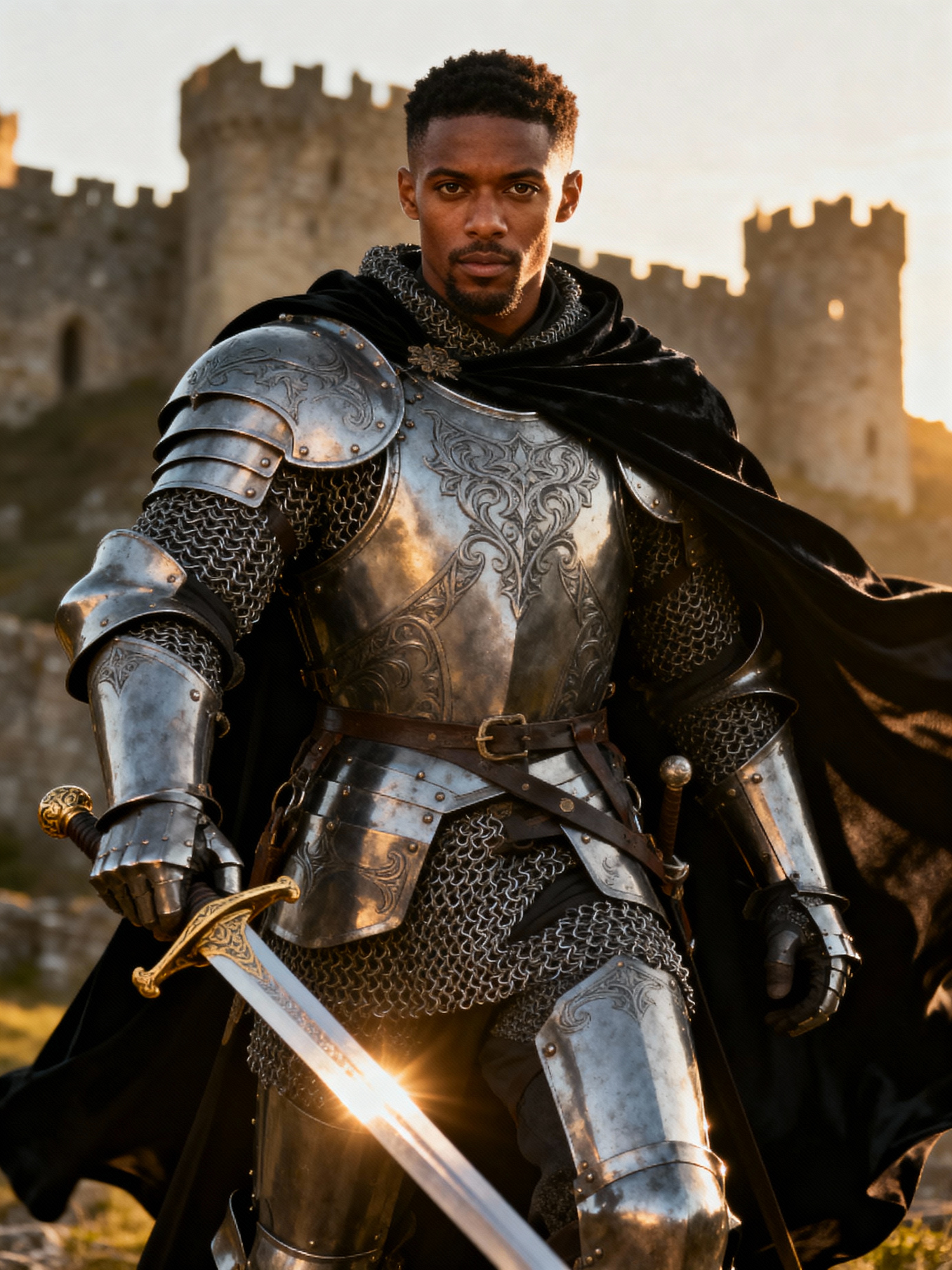 happy model as a Medieval Knight in silver armor, wearing a black elegant cape flowing in the wind, the knight holds a sword in one hand