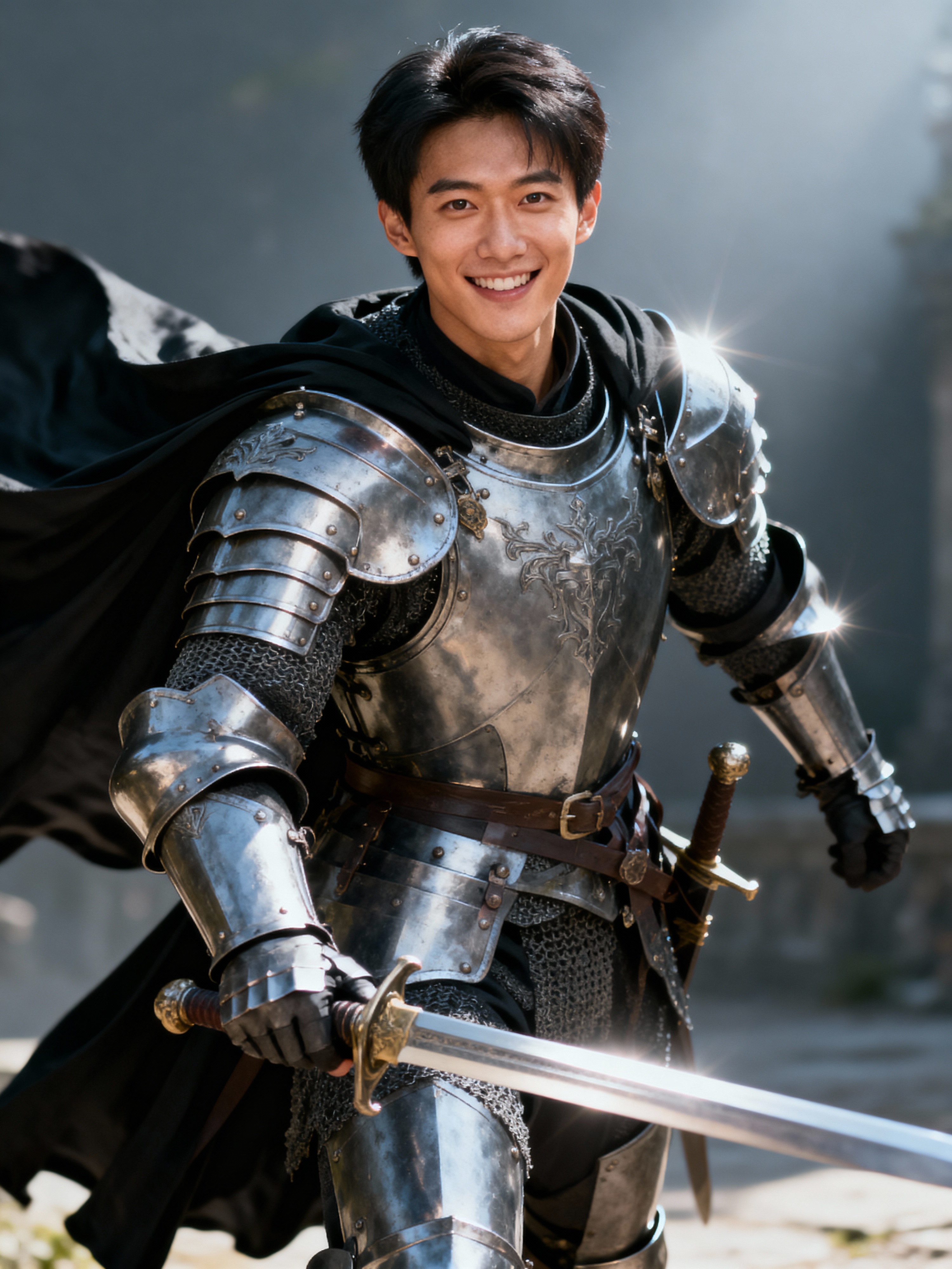happy model as a Medieval Knight in silver armor, wearing a black elegant cape flowing in the wind, the knight holds a sword in one hand