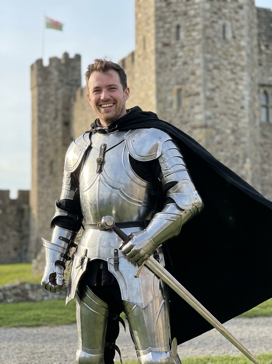 happy model as a Medieval Knight in silver armor, wearing a black elegant cape flowing in the wind, the knight holds a sword in one hand