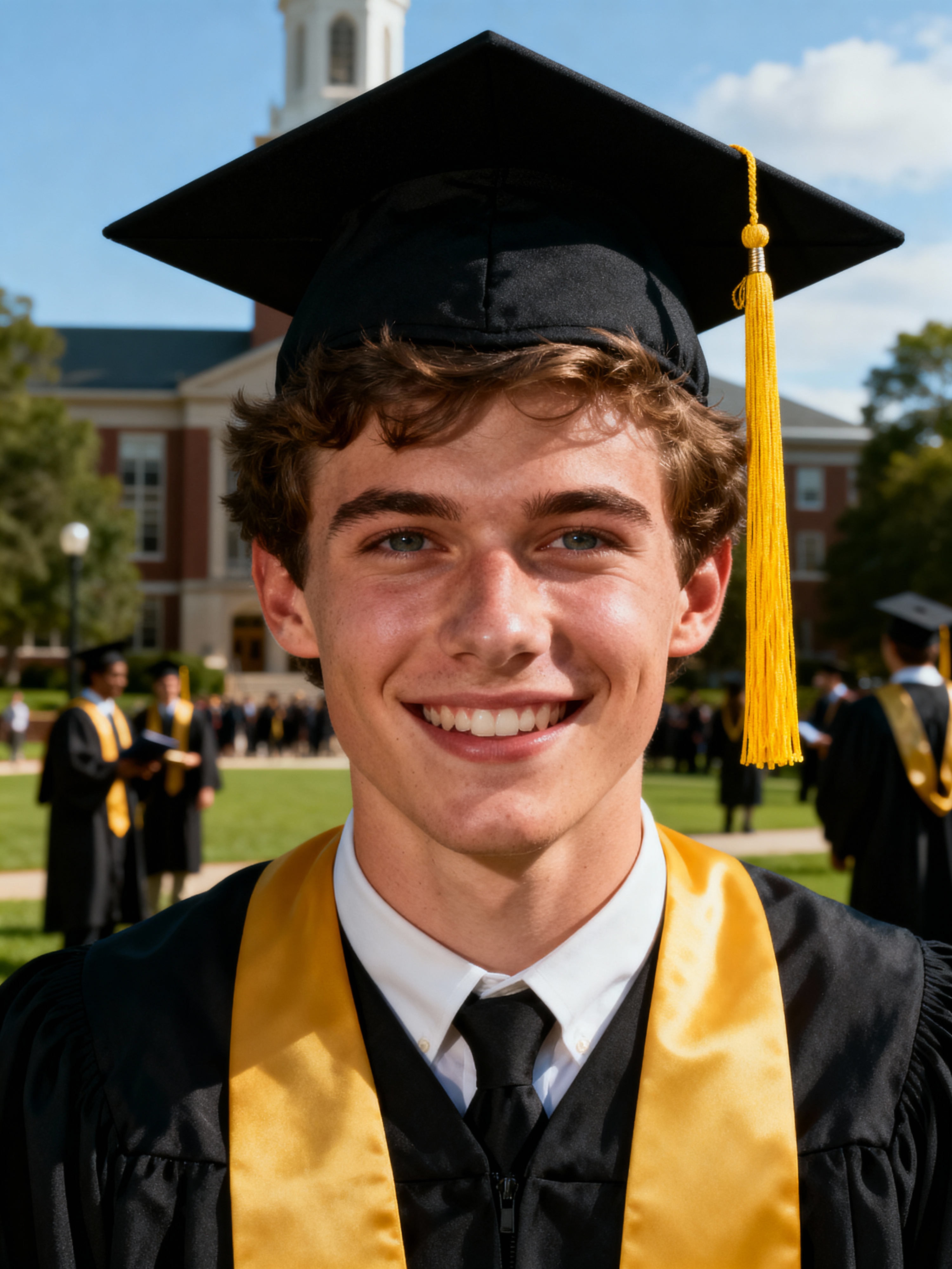 happy model in Graduation Ceremony wearing a square black Graduation Cap with yellow tassel at college