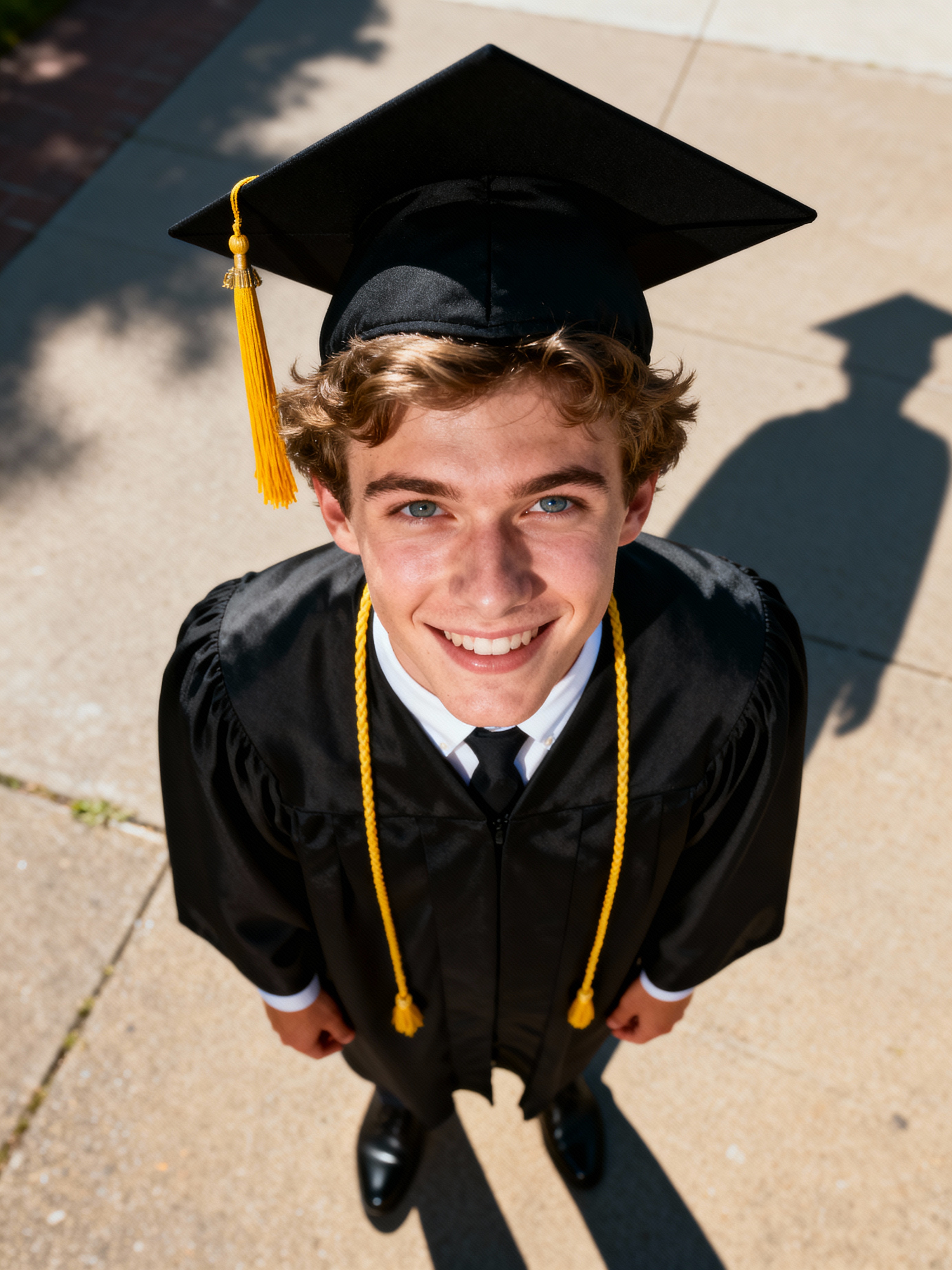 happy model in Graduation Ceremony wearing a square black Graduation Cap with yellow tassel at college