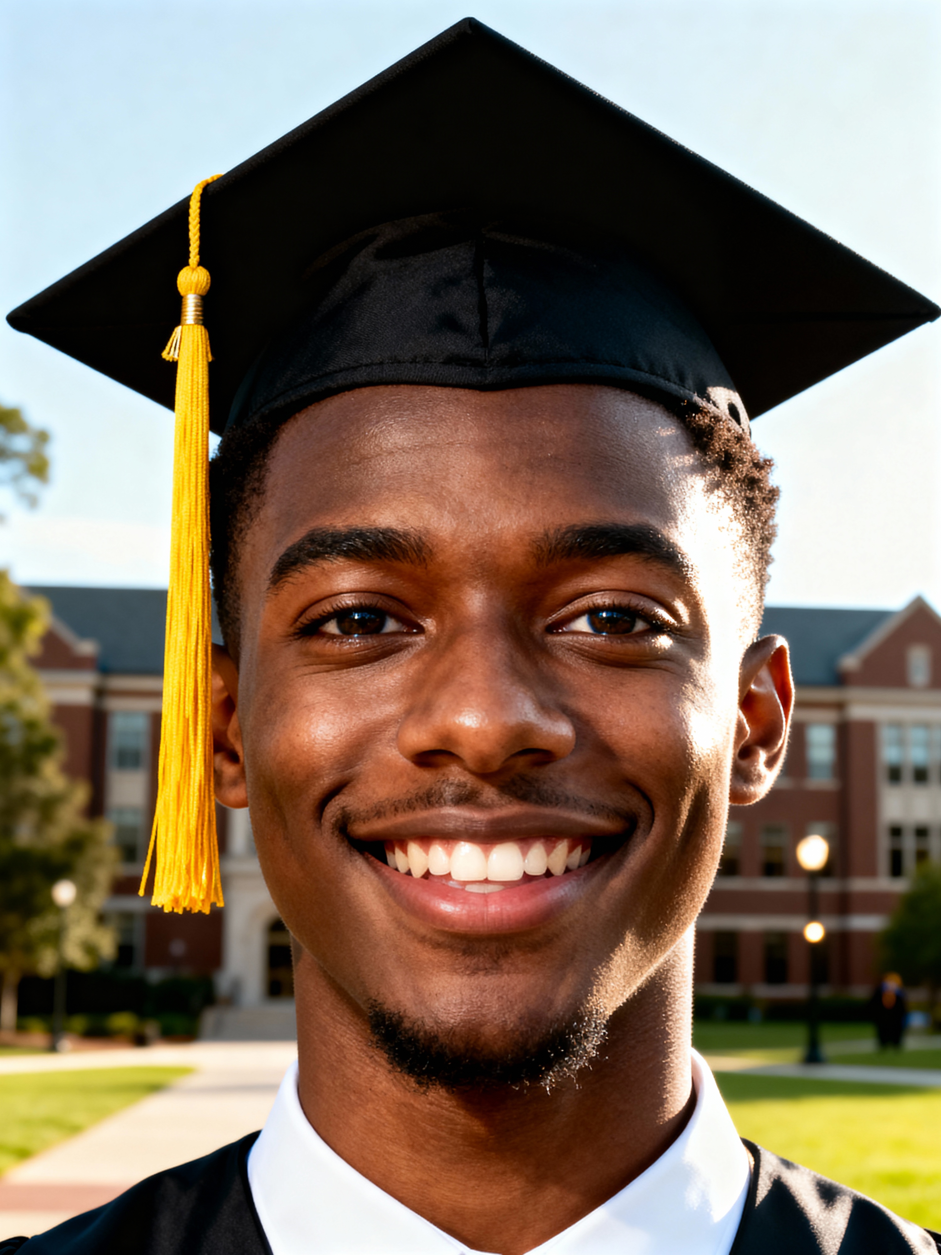 happy model in Graduation Ceremony wearing a square black Graduation Cap with yellow tassel at college