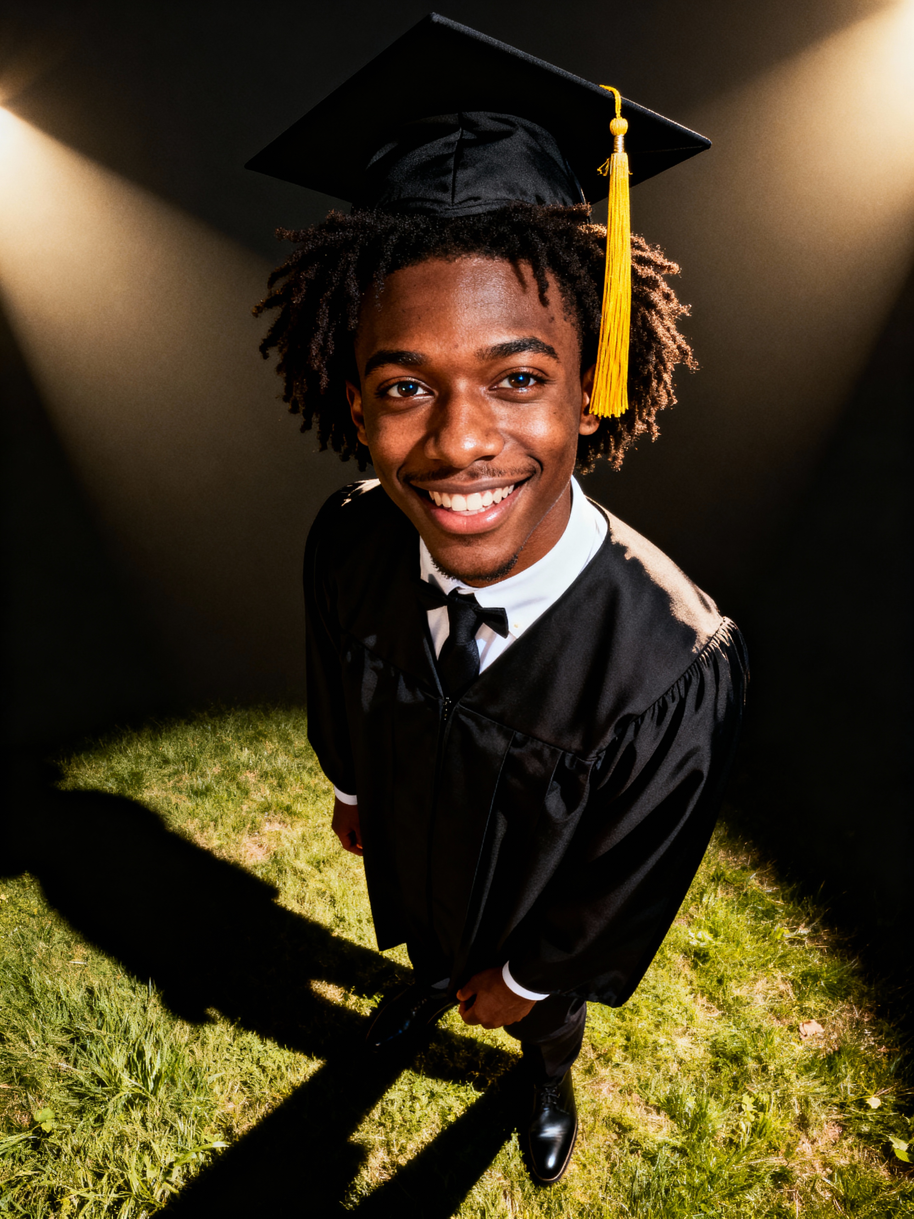 happy model in Graduation Ceremony wearing a square black Graduation Cap with yellow tassel at college