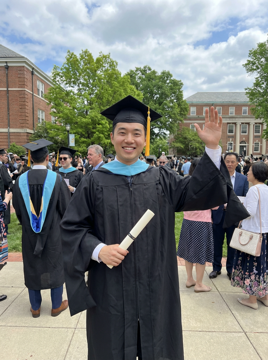 happy model in Graduation Ceremony wearing a square black Graduation Cap with yellow tassel at college