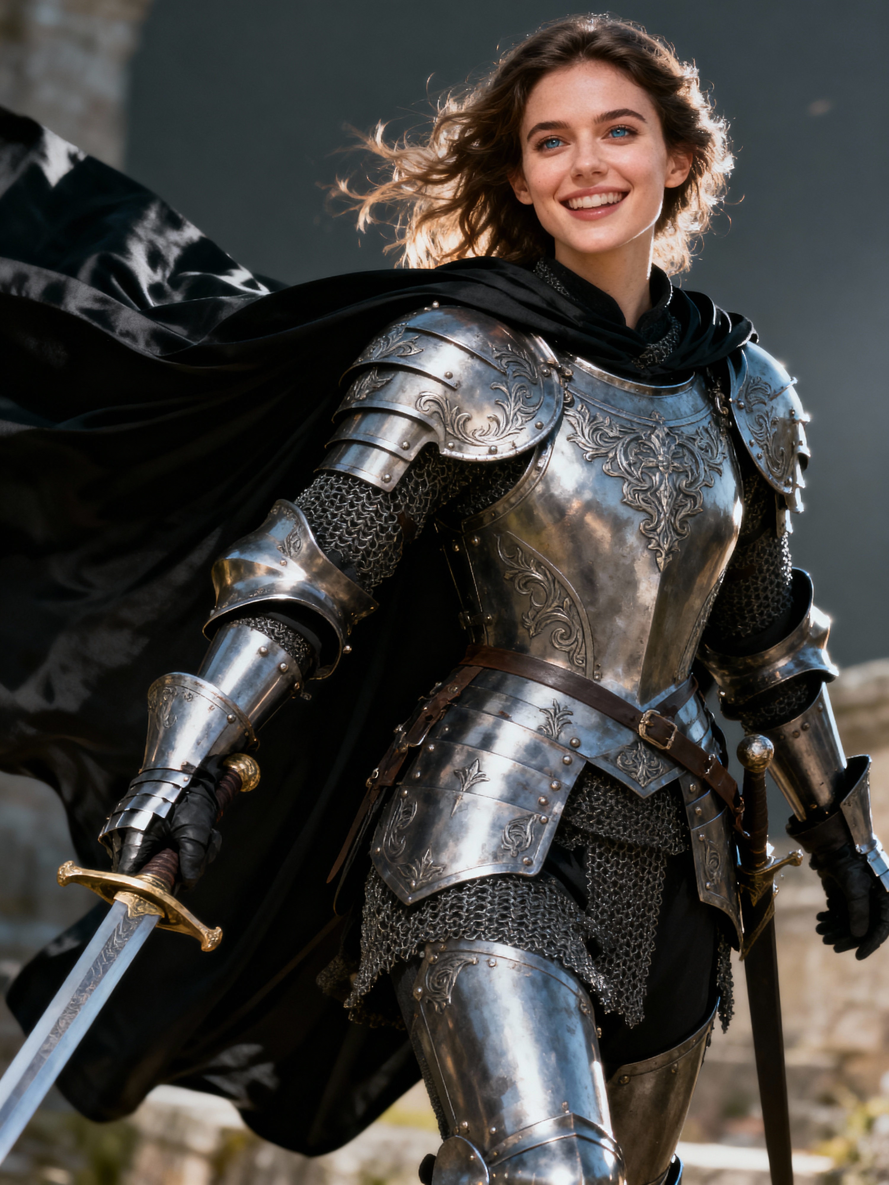 happy model as a Medieval Knight in silver armor, wearing a black elegant cape flowing in the wind, the knight holds a sword in one hand