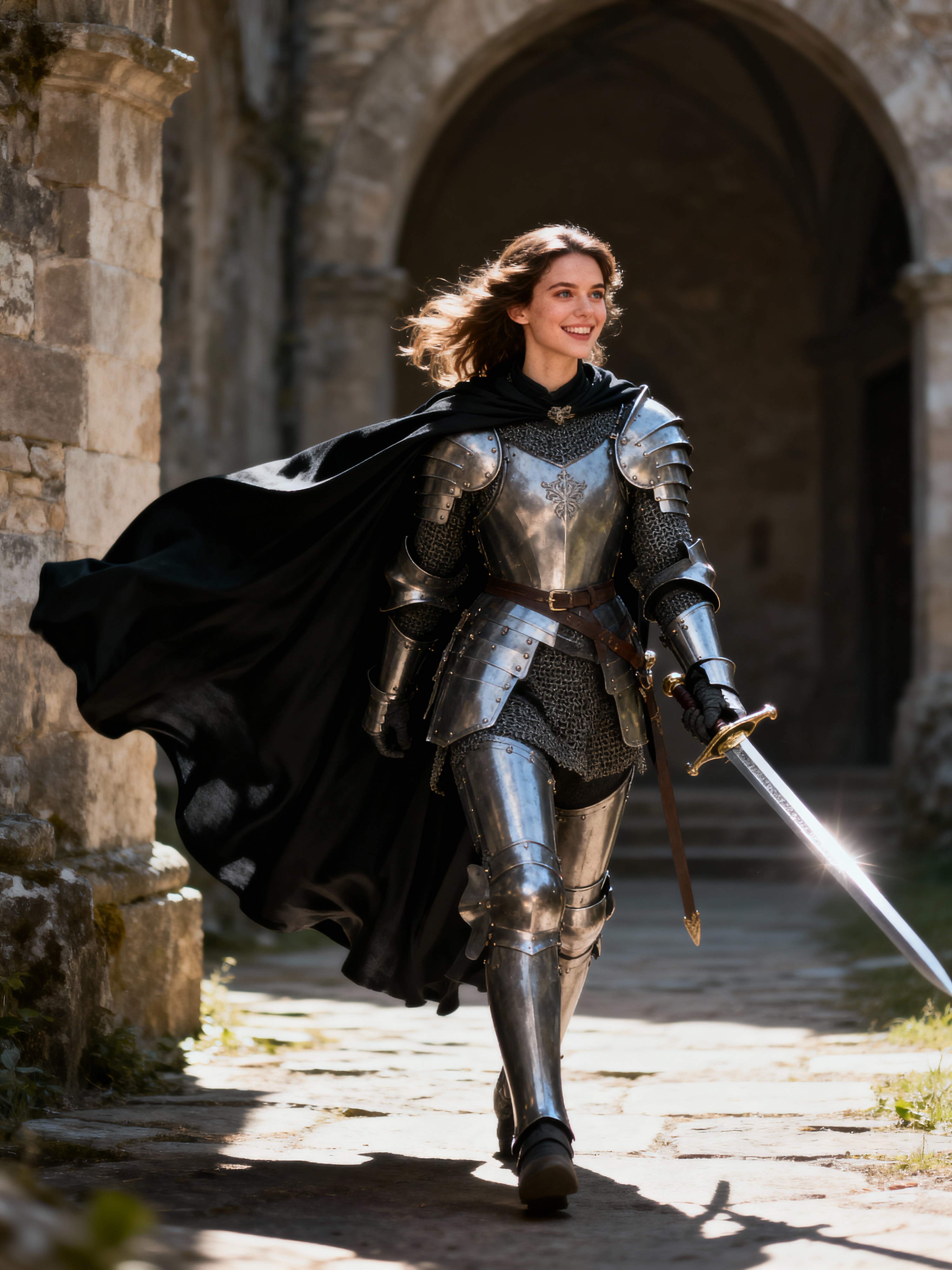 happy model as a Medieval Knight in silver armor, wearing a black elegant cape flowing in the wind, the knight holds a sword in one hand