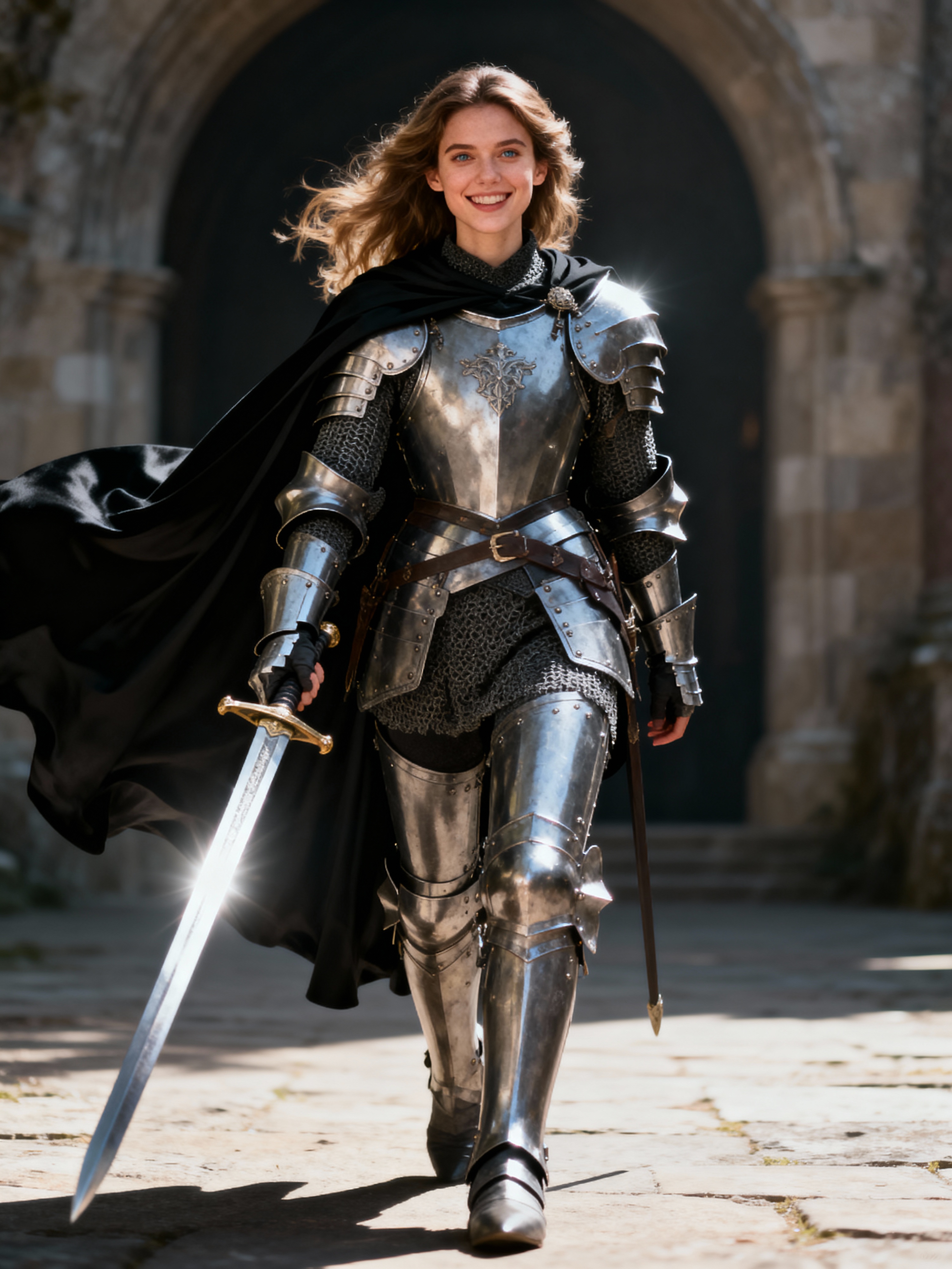 happy model as a Medieval Knight in silver armor, wearing a black elegant cape flowing in the wind, the knight holds a sword in one hand