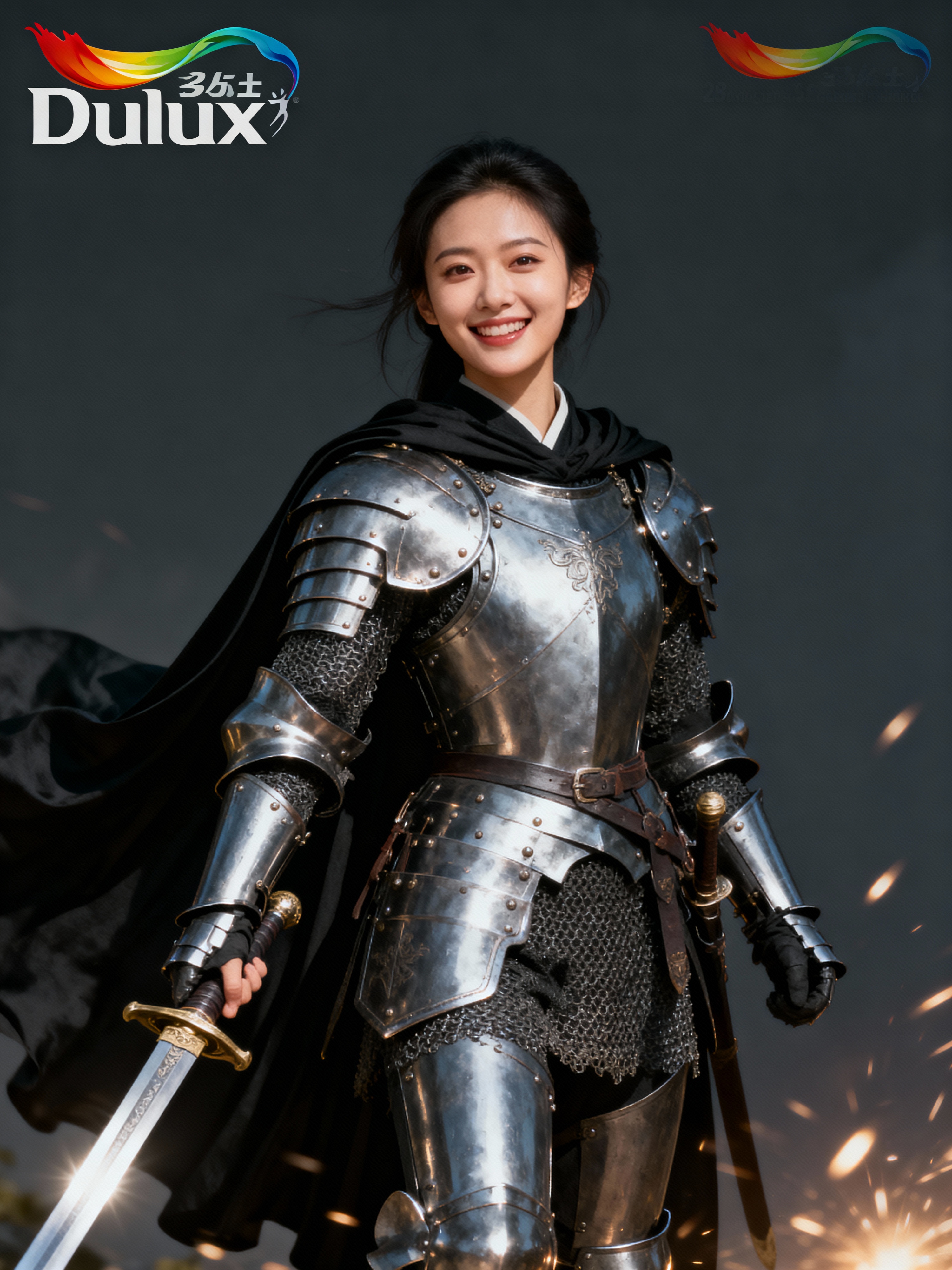 happy model as a Medieval Knight in silver armor, wearing a black elegant cape flowing in the wind, the knight holds a sword in one hand