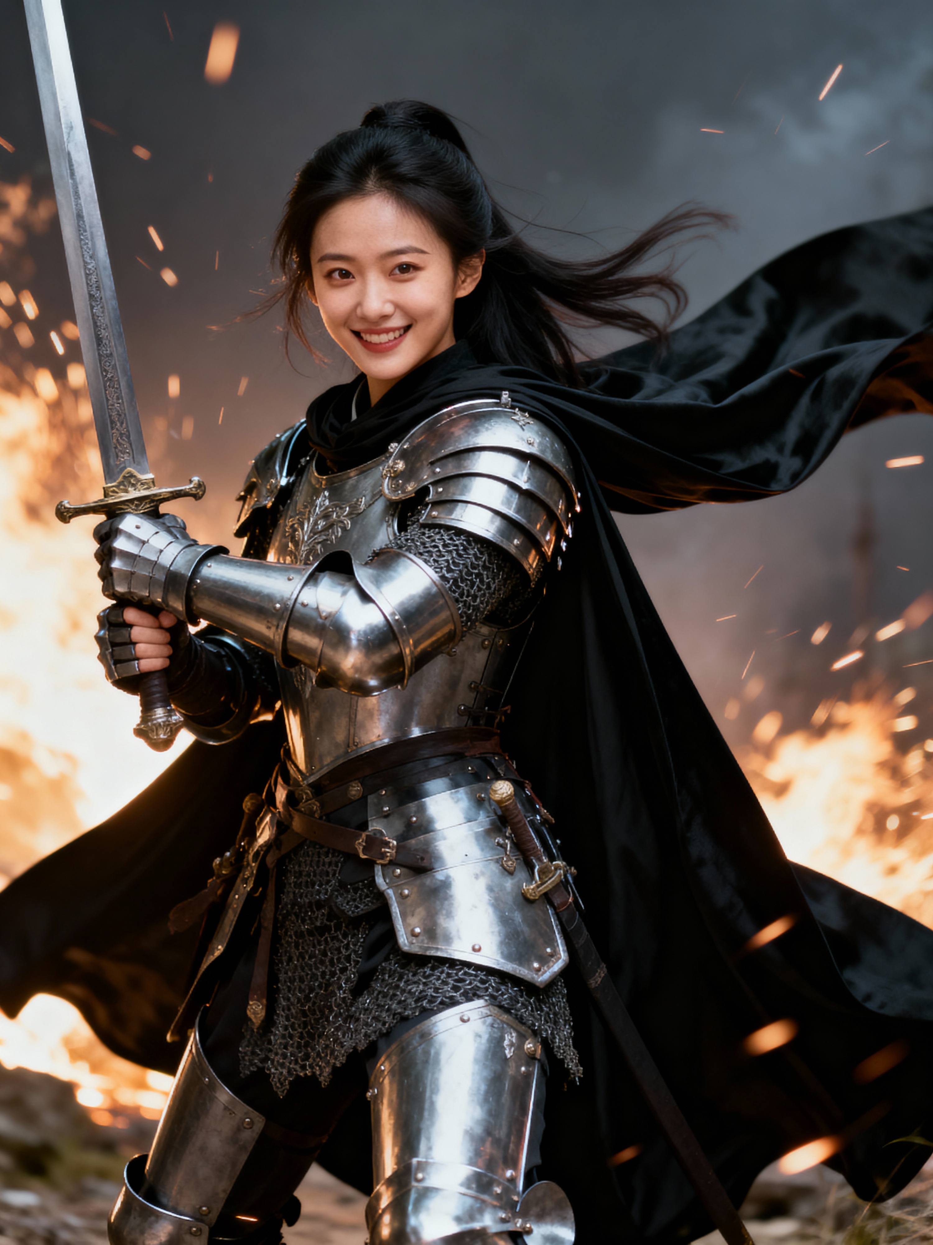 happy model as a Medieval Knight in silver armor, wearing a black elegant cape flowing in the wind, the knight holds a sword in one hand