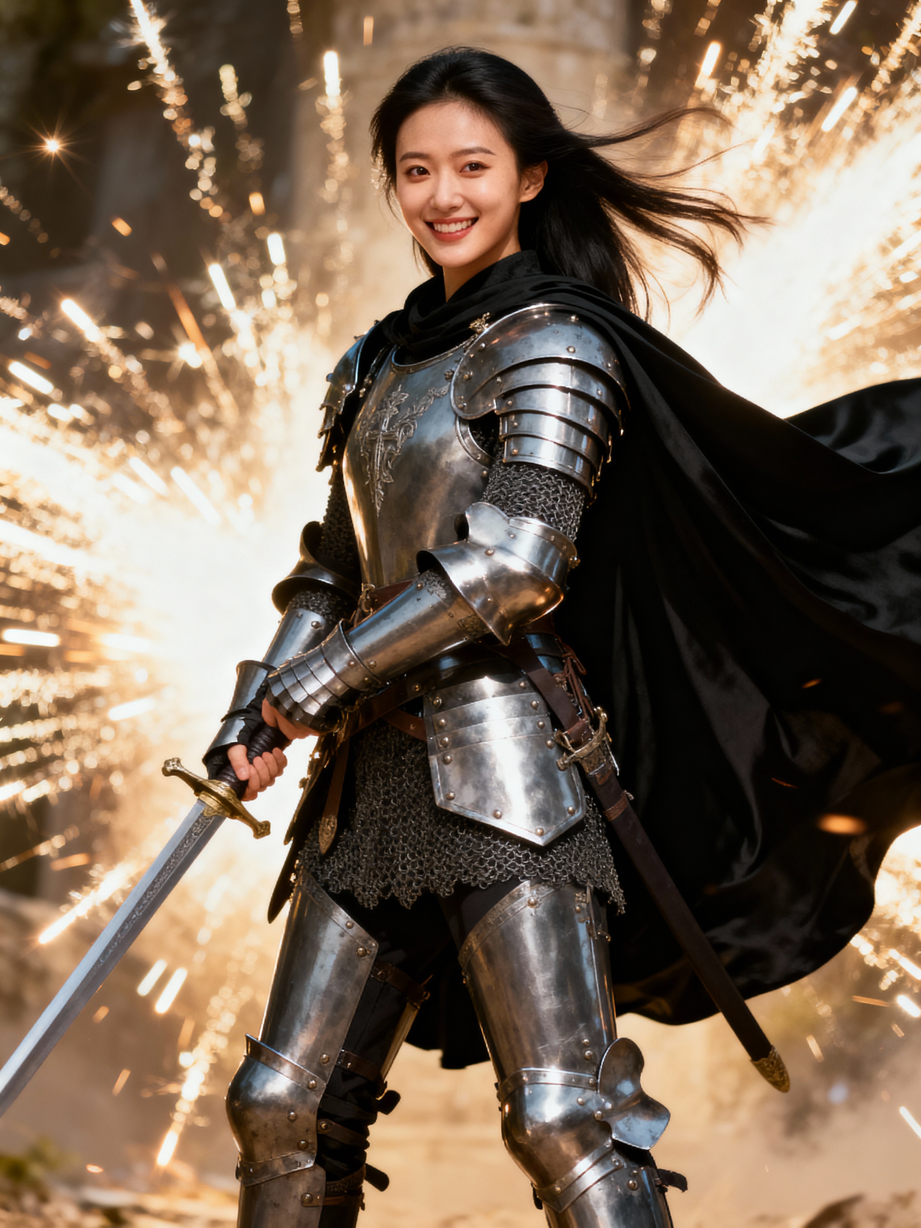 happy model as a Medieval Knight in silver armor, wearing a black elegant cape flowing in the wind, the knight holds a sword in one hand