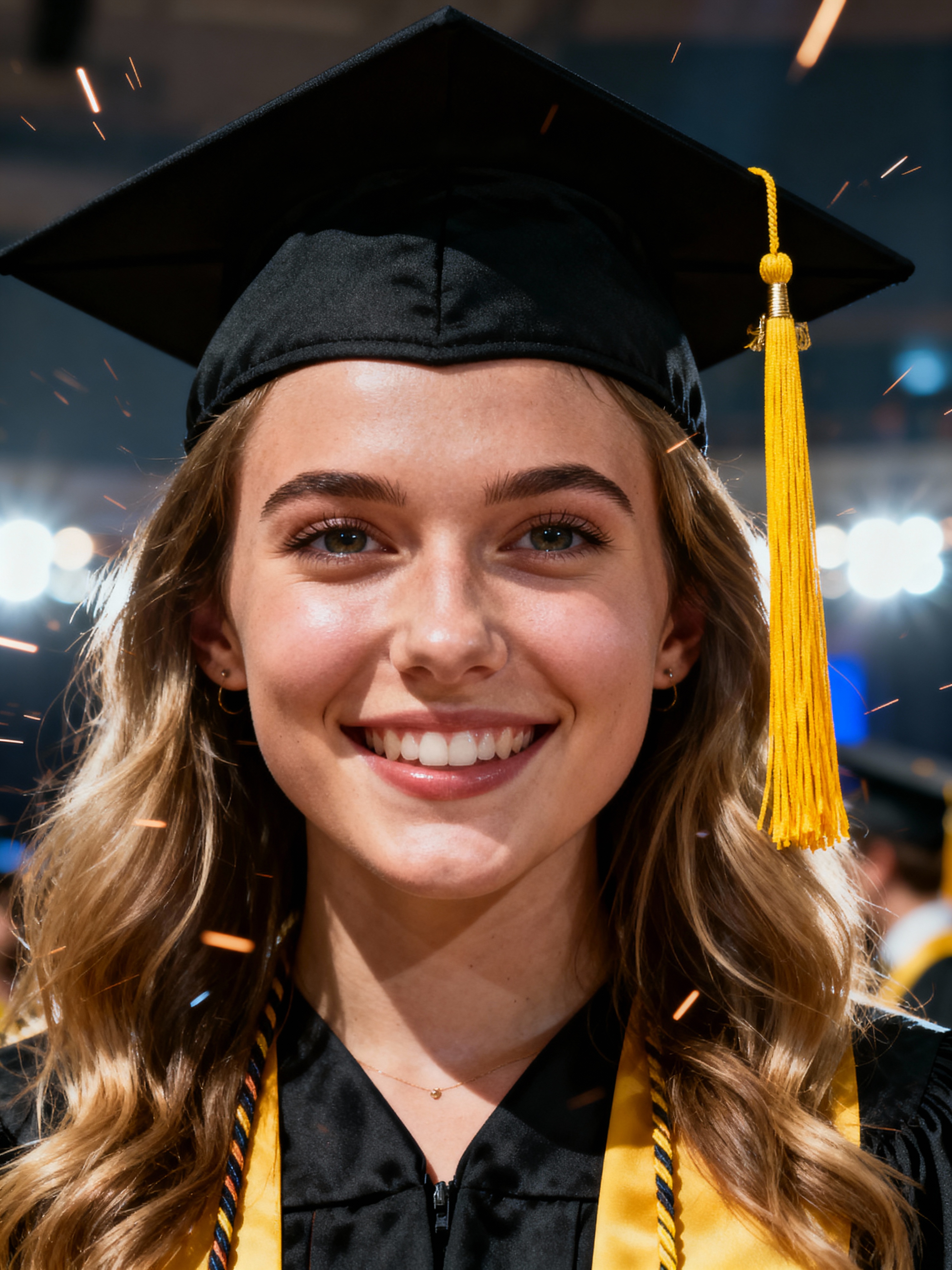 happy model in Graduation Ceremony wearing a square black Graduation Cap with yellow tassel at college