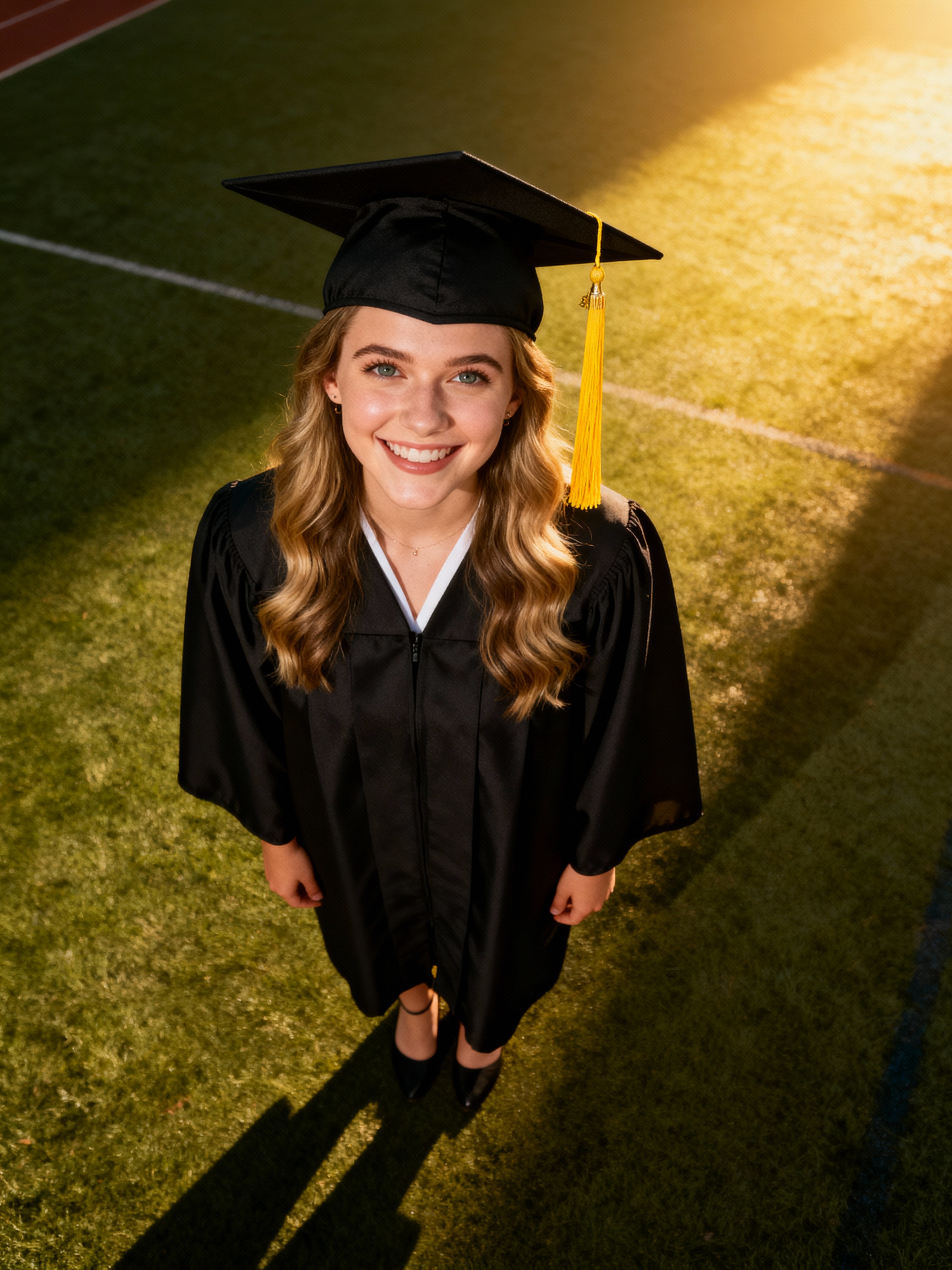 happy model in Graduation Ceremony wearing a square black Graduation Cap with yellow tassel at college