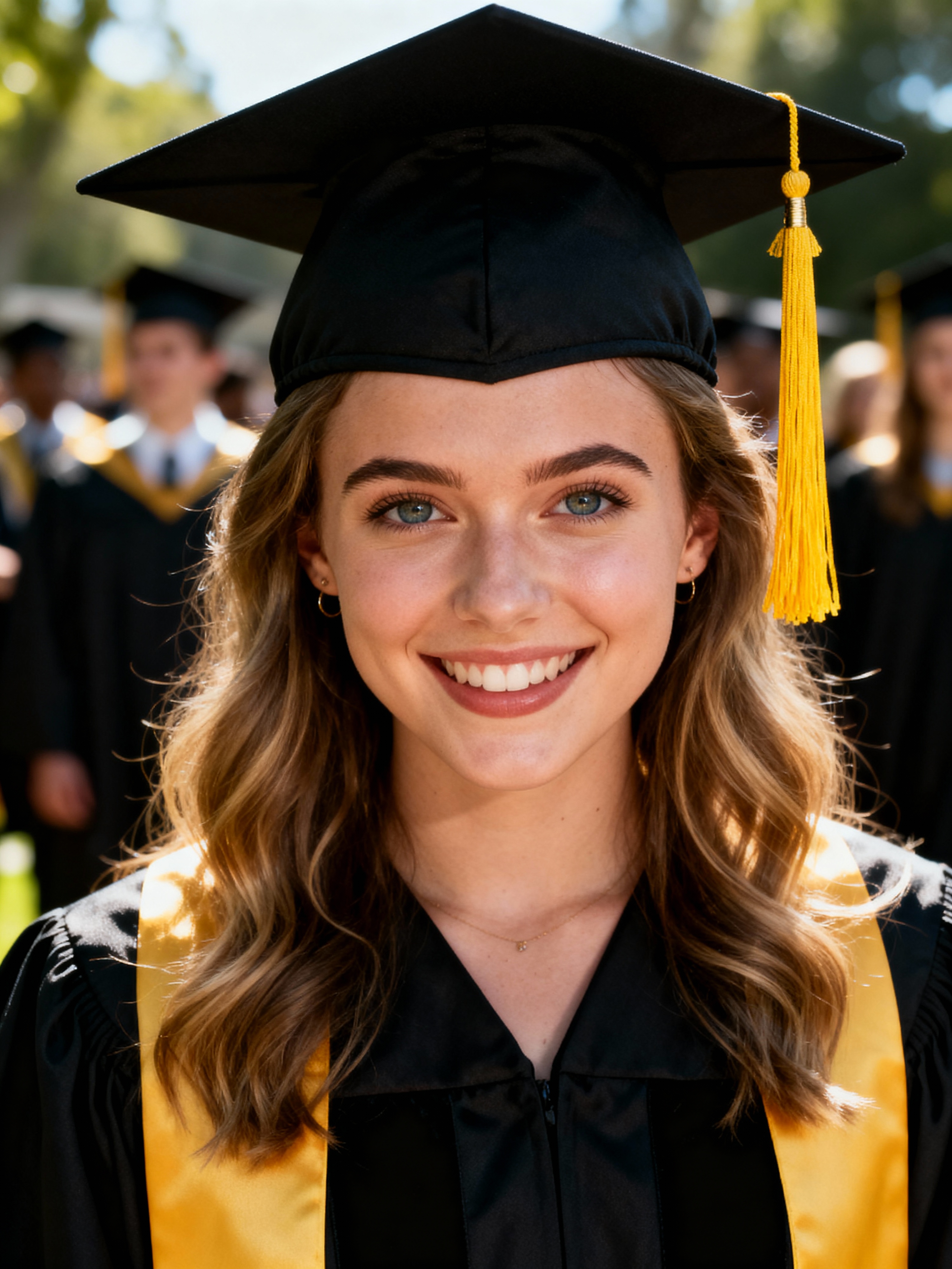 happy model in Graduation Ceremony wearing a square black Graduation Cap with yellow tassel at college