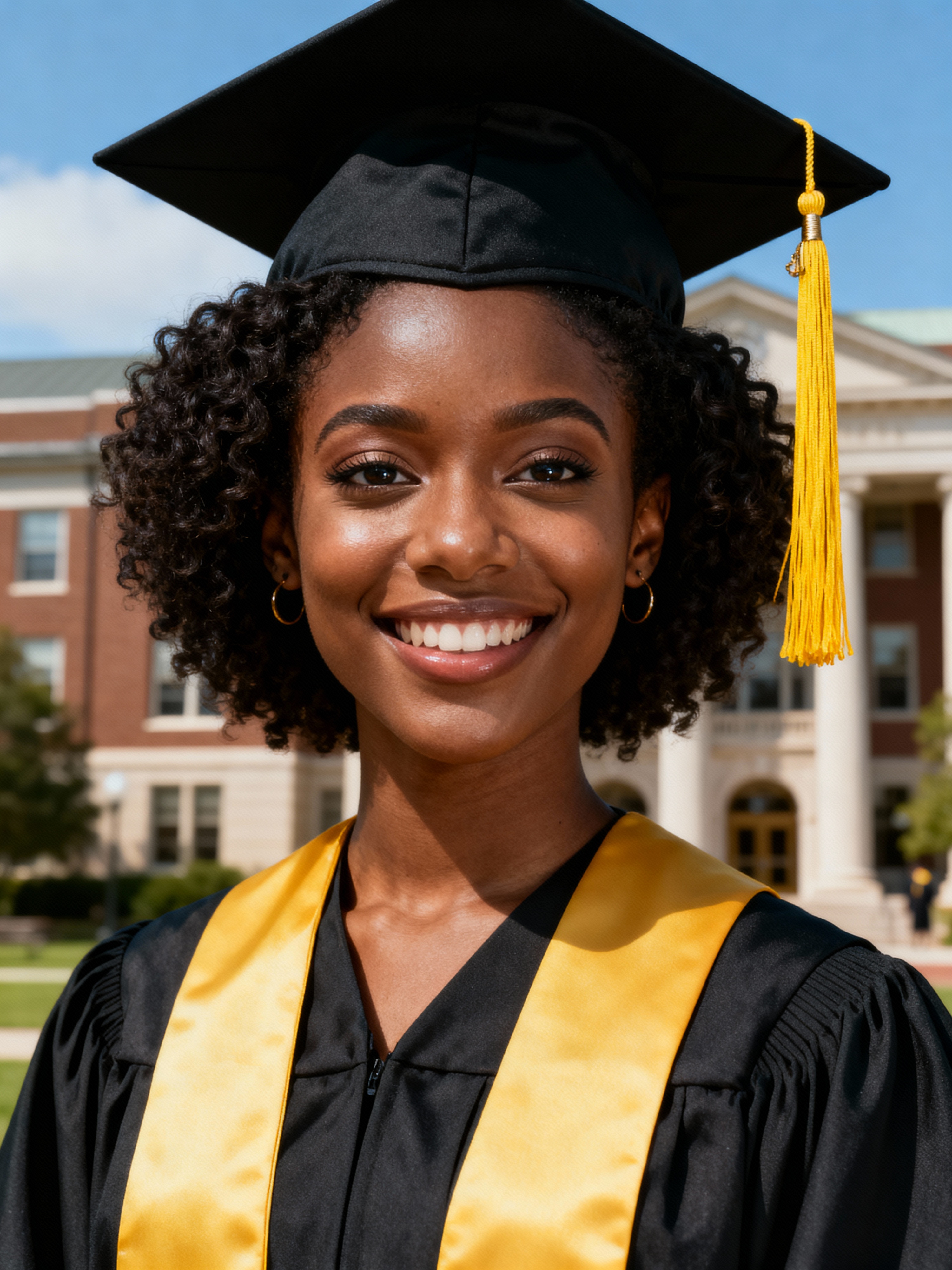 happy model in Graduation Ceremony wearing a square black Graduation Cap with yellow tassel at college