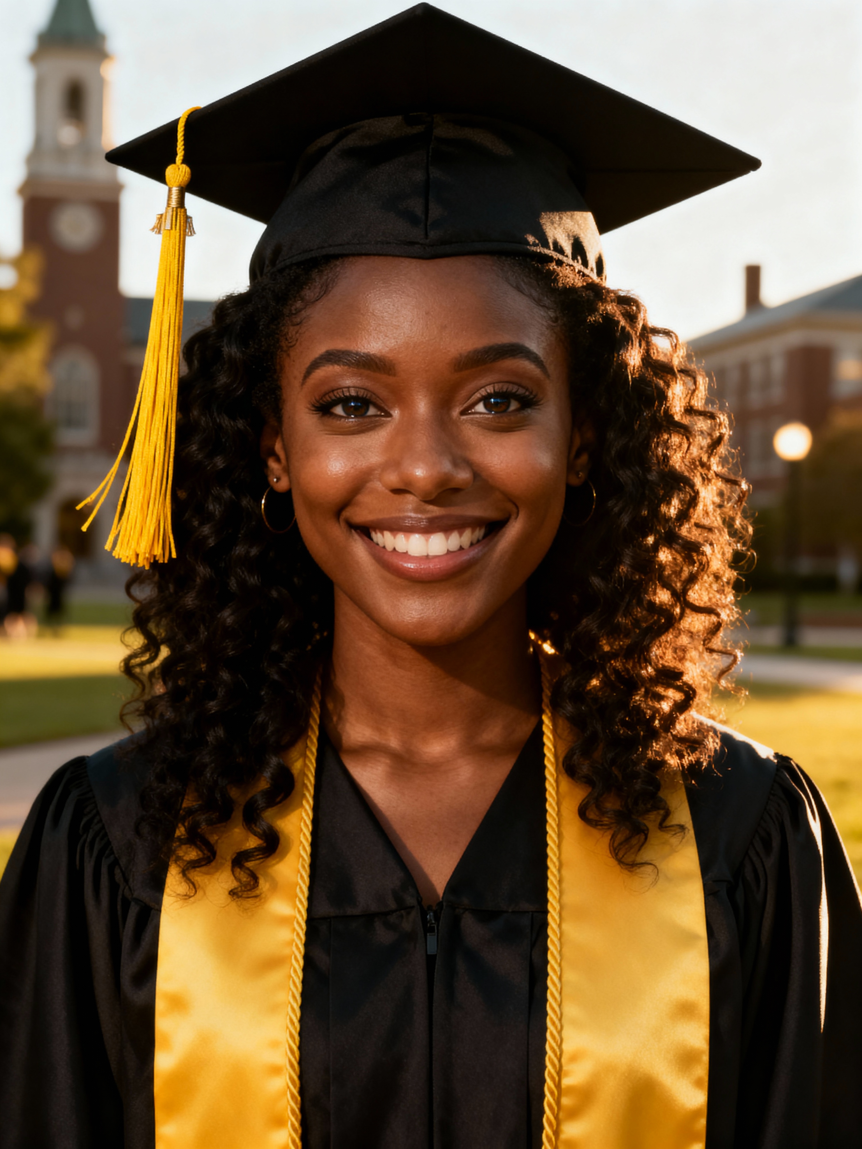 happy model in Graduation Ceremony wearing a square black Graduation Cap with yellow tassel at college