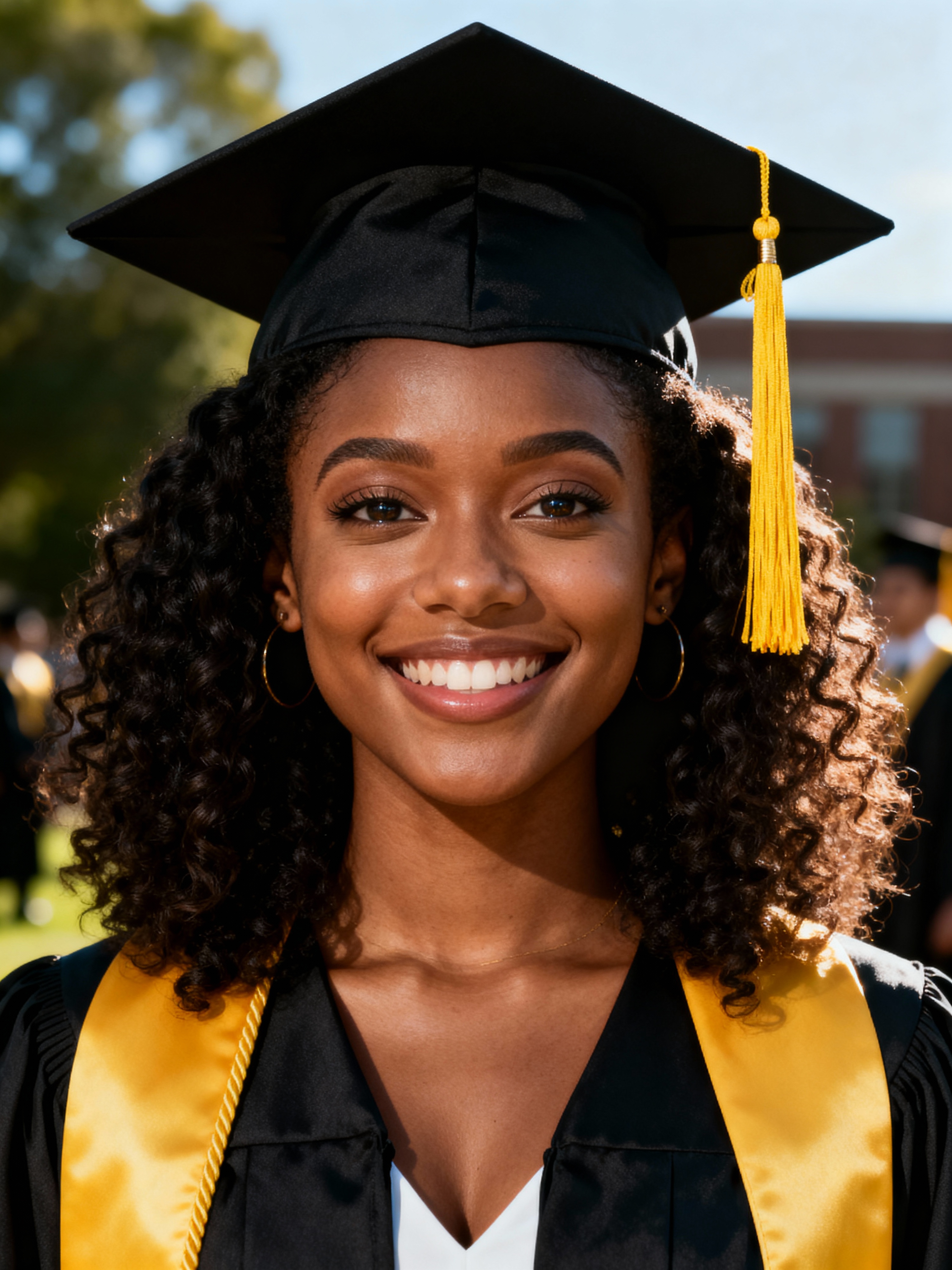 happy model in Graduation Ceremony wearing a square black Graduation Cap with yellow tassel at college